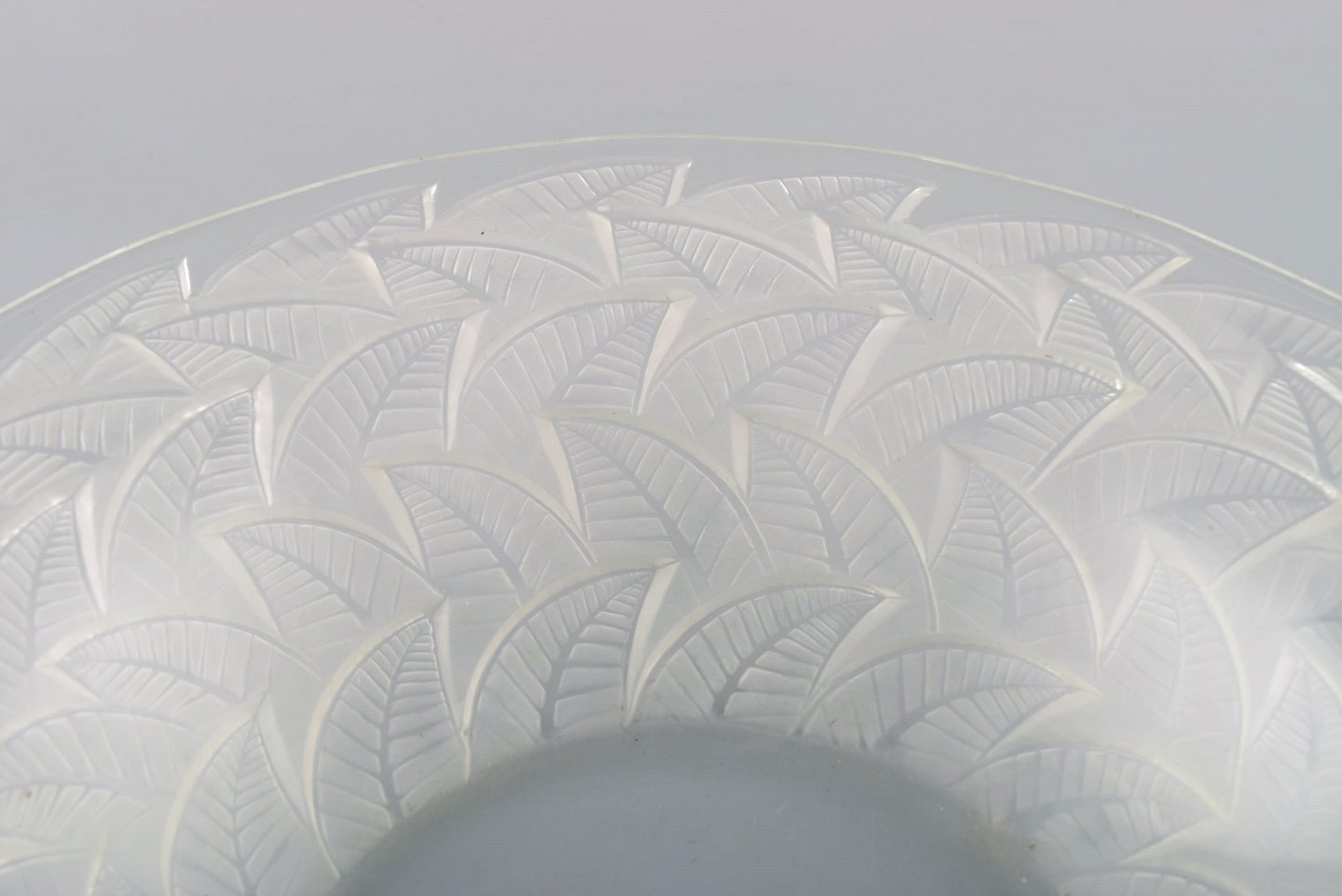 Tidlig René Lalique. Stor "Ormeaux" skål i kunstglas med bladværk. Modelnummer 3049. Dateret før 1945. Designet 1931. Stemplet: R. Lalique. I flot stand. Måler: 31 x 7 cm.