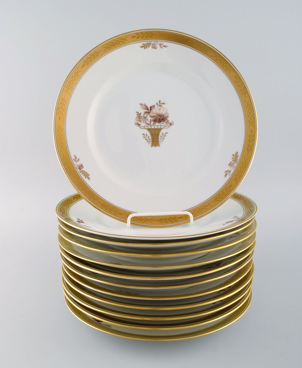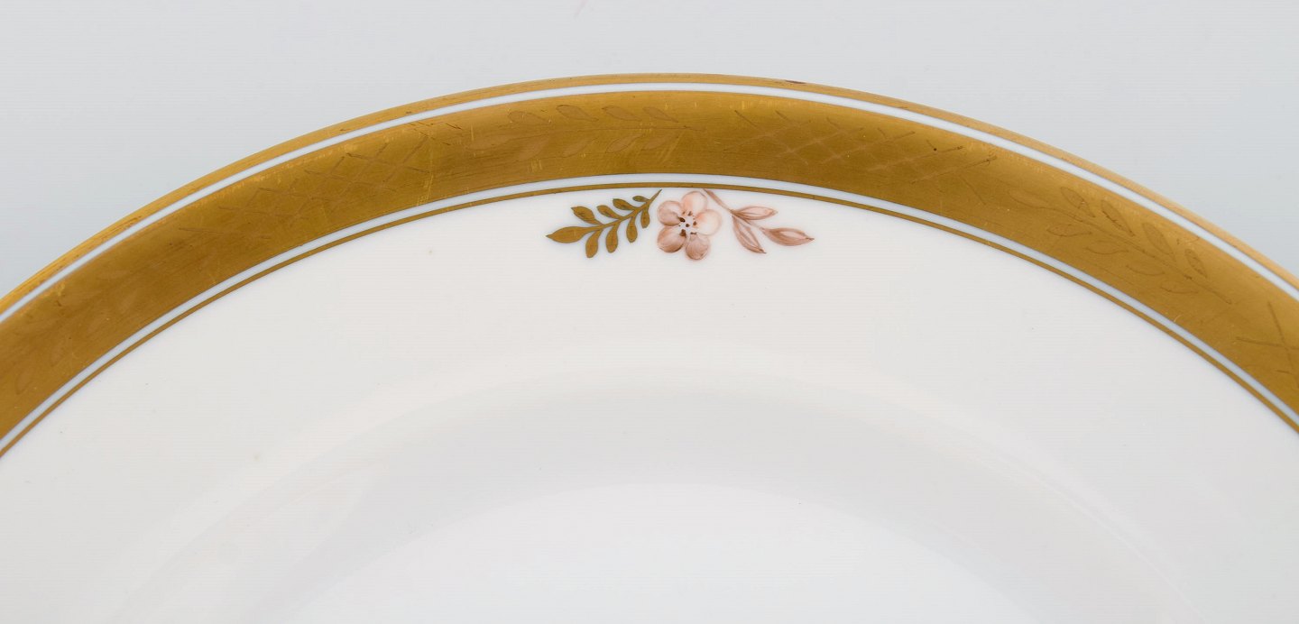 12 Royal Copenhagen "Guldkurv" middagstallerkener med guldkant. Modelnummer 9586. Midt 1900-tallet.