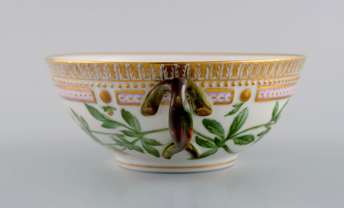 Royal Copenhagen Flora Danica boullion cup with saucer in hand-painted porcelain with branch-shaped handles, flowers and gold decoration. Model number 20/3612.
