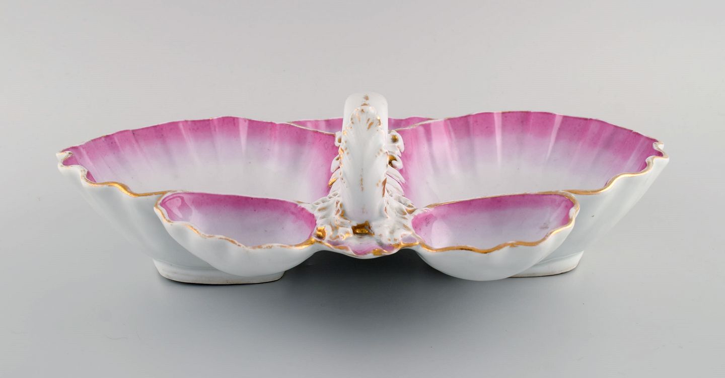 Antikt Meissen caberetfad med hank i håndmalet porcelæn med lyserød og gulddekoration. Sent 1800-tallet. Måler: 37 x 26,5 x 11,5 cm. I flot stand. Stemplet. 1. Sortering.