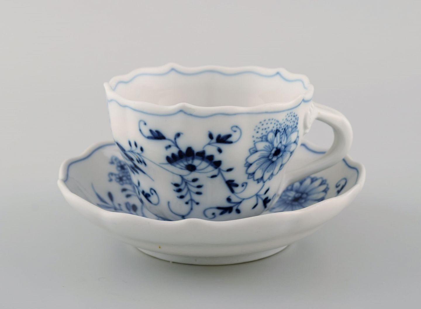 Stadt Meissen løgmønstret. To kaffekopper med underkopper, to tallerkener og sukkerskål. Midt 1900-tallet.