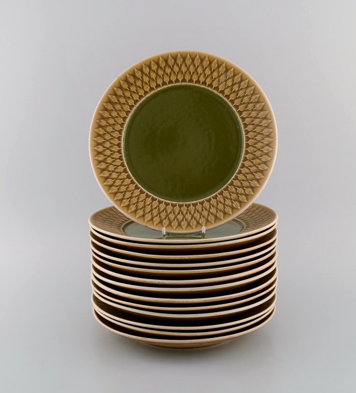 Jens H. Quistgaard (1919-2008) for Bing & Grøndahl. 14 Relief middagstallerkener i glaseret stentøj. Smuk glasur i sennepsgule og grønne nuancer. 1960'erne. Diameter: 25 cm. Stemplet. I flot stand.