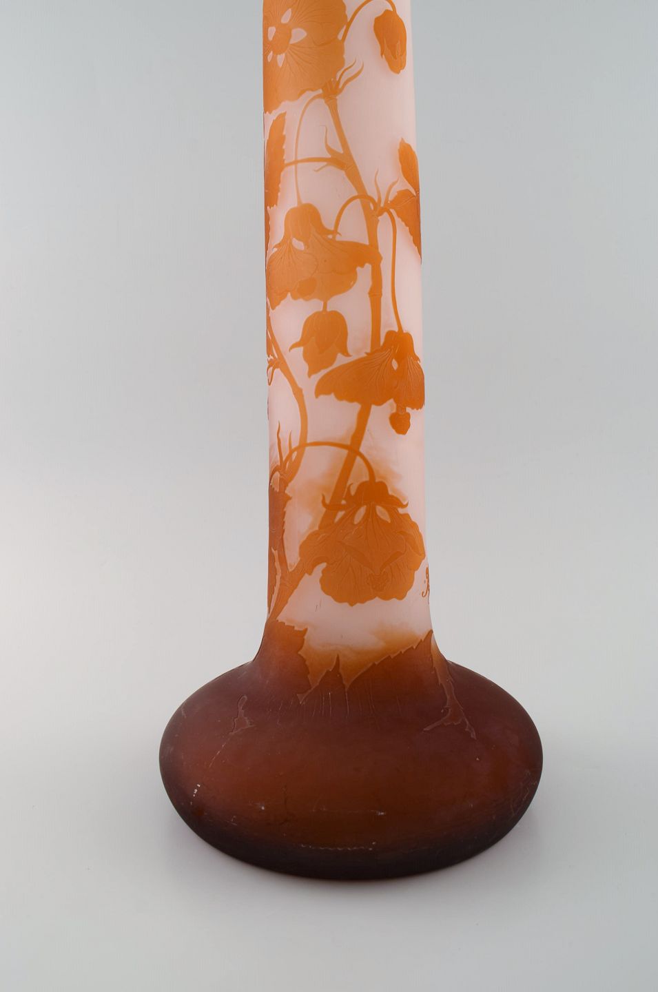 Colossal antique Emile Gallé vase in frosted and orange art glass carved in the form of flowers and foliage. Early 20th century. Museum quality. Measures: 61 x 19 cm. In excellent condition. Signed.