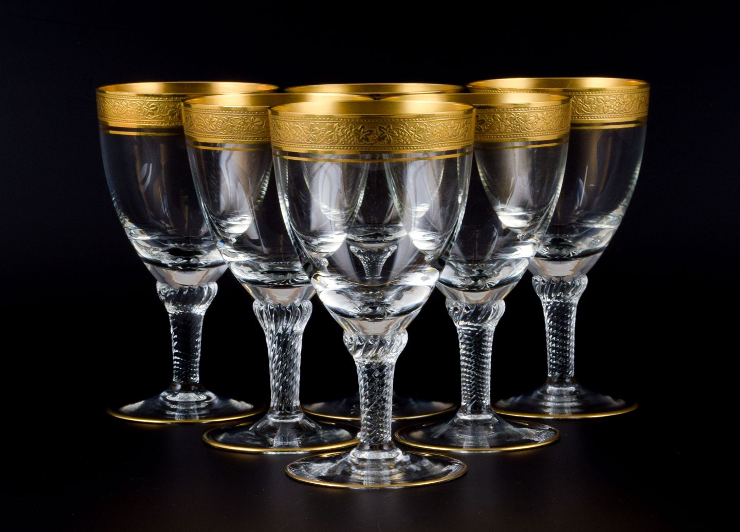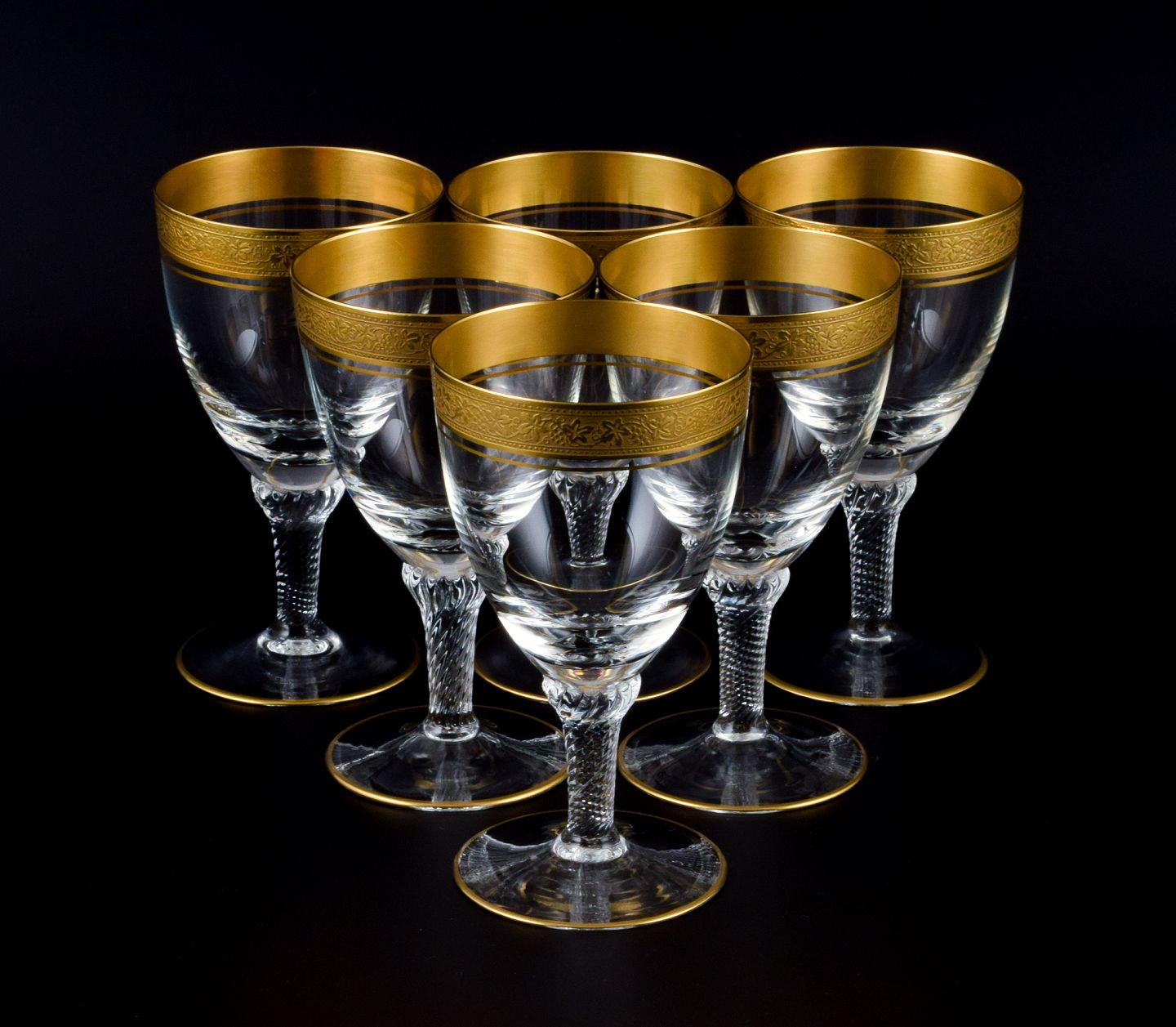 Rimpler Kristall, Zwiesel, Germany, six hand blown crystal red wine glasses with gold rim decorated with grapes and vine leaves. 1960s. In perfect condition. Dimensions: H 13.5 x D 7.5 cm.