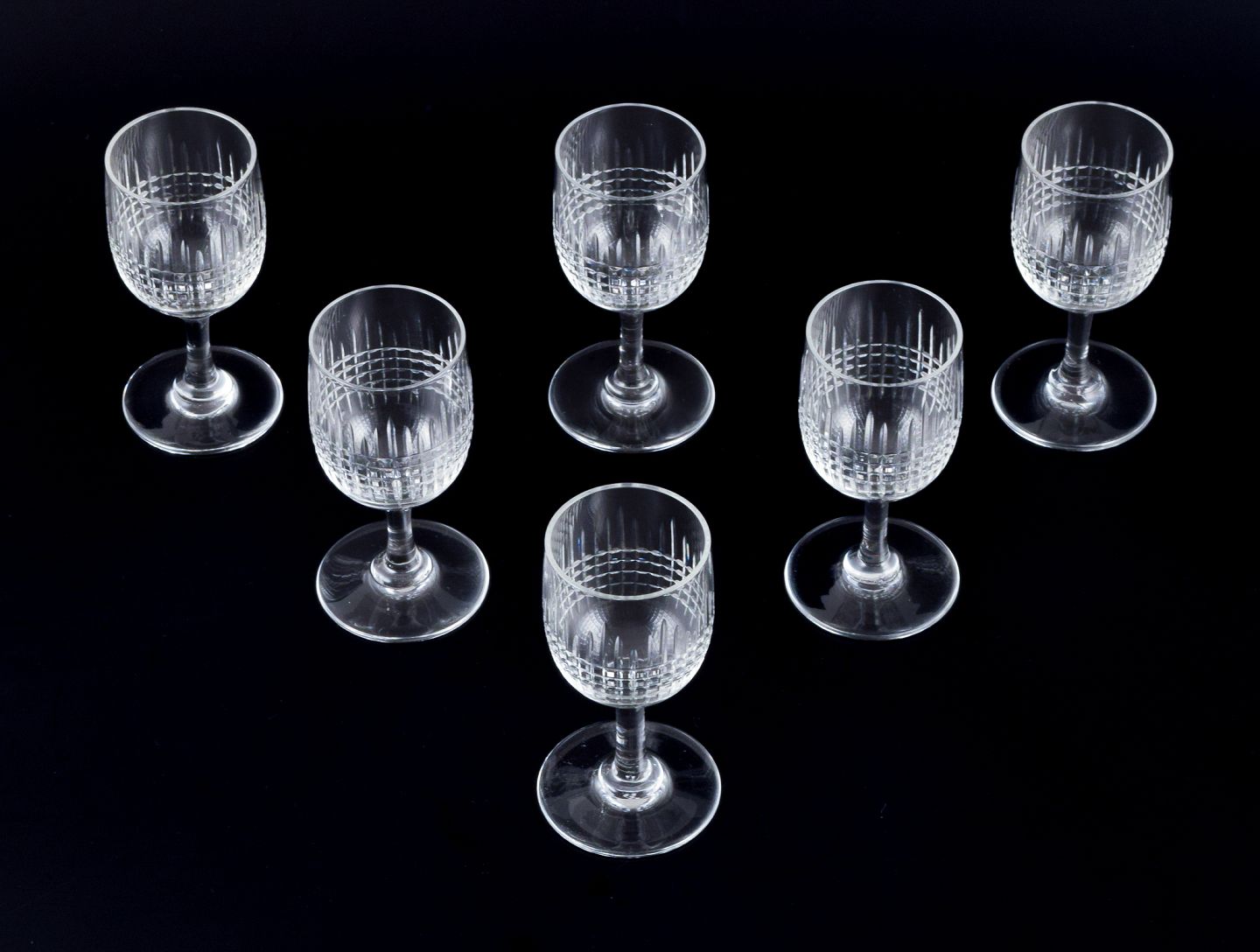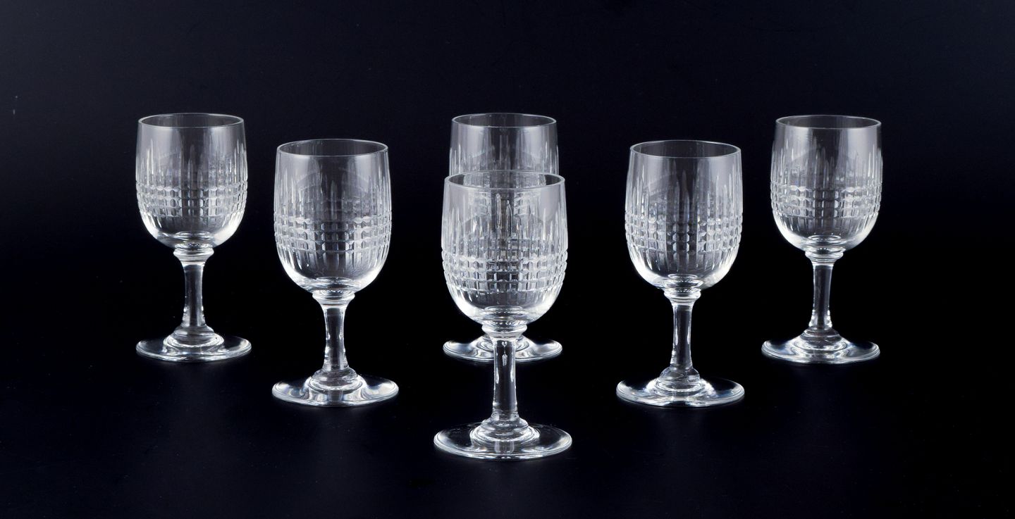 Baccarat, France. A set of six "Nancy" white wine glasses in clear crystal glass. Approximately 1930. In perfect condition. Dimensions: H 11.0 cm x 4.9 cm.