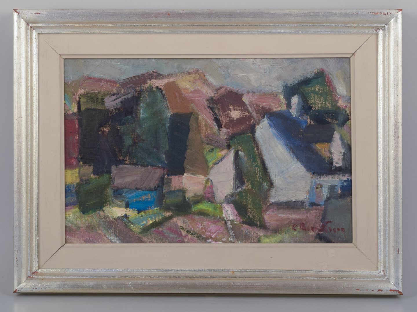 Carl Berndtsson (1902 - 1983), svensk maler. Olie på lærred. Abstrakt landskab. Koloristisk palette. Ca. 1960. Signeret. Perfekt stand. Mål: B 33,5 cm. x H 22,0 cm. Total: 45,0 cm. x 33,0 cm.
