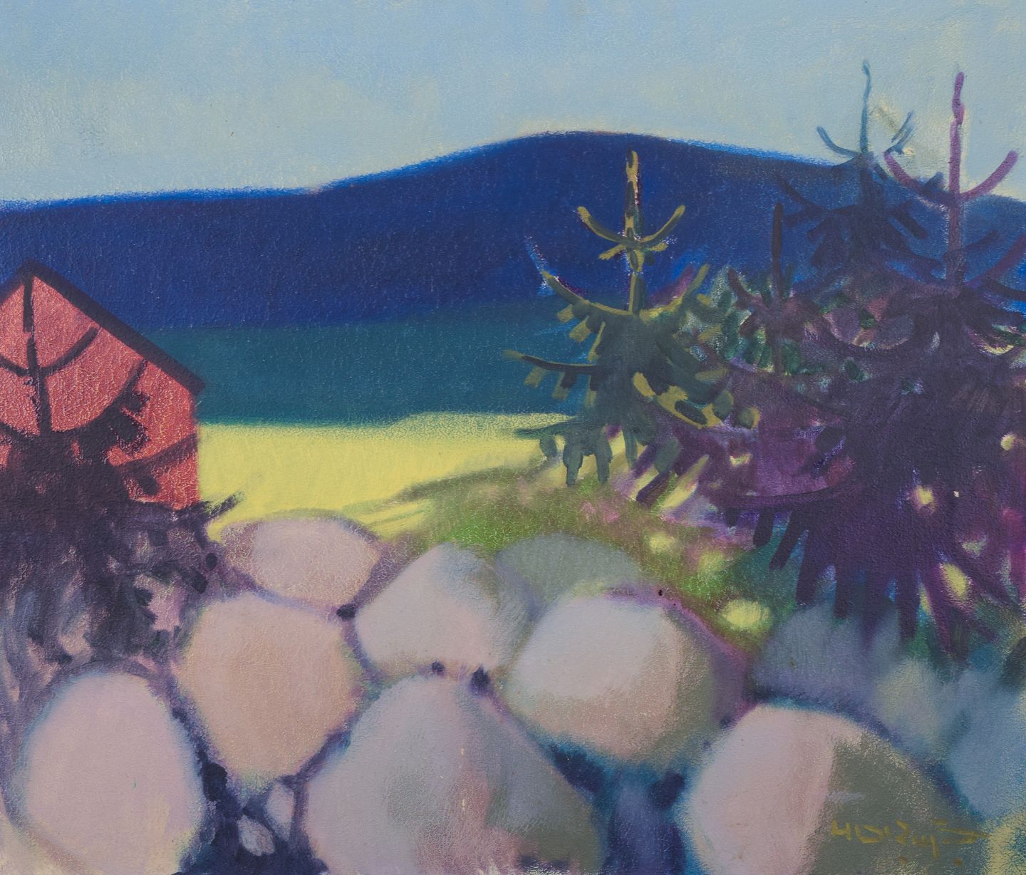 Knud Horup (1926-1973), Danish artist, oil on canvas. House in landscape. Mid-20th century. Signed. In perfect condition. Dimensions: 70 cm x 60 cm. Total with frame: 87 cm x 77 cm.