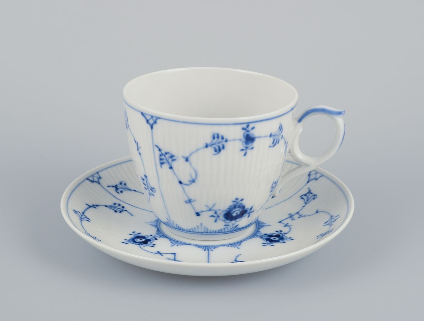 Royal Copenhagen Musselmalet Riflet, fire kaffekopper med tilhørende underkopper. Sjælden kop i ekstra stor størrelse.