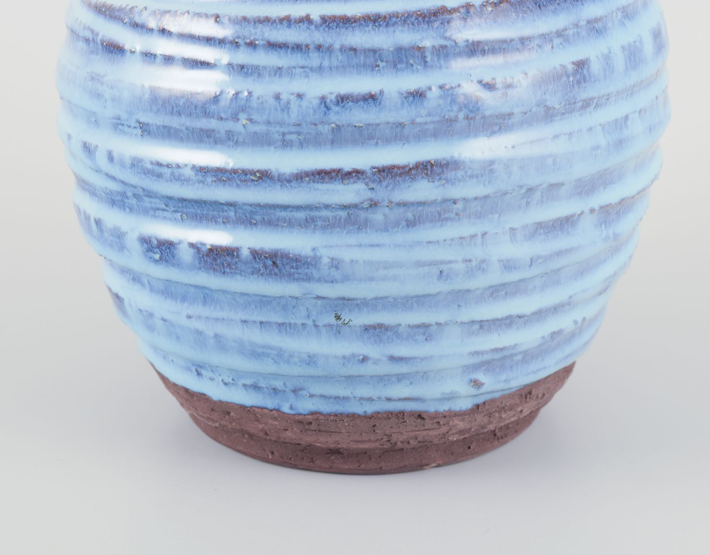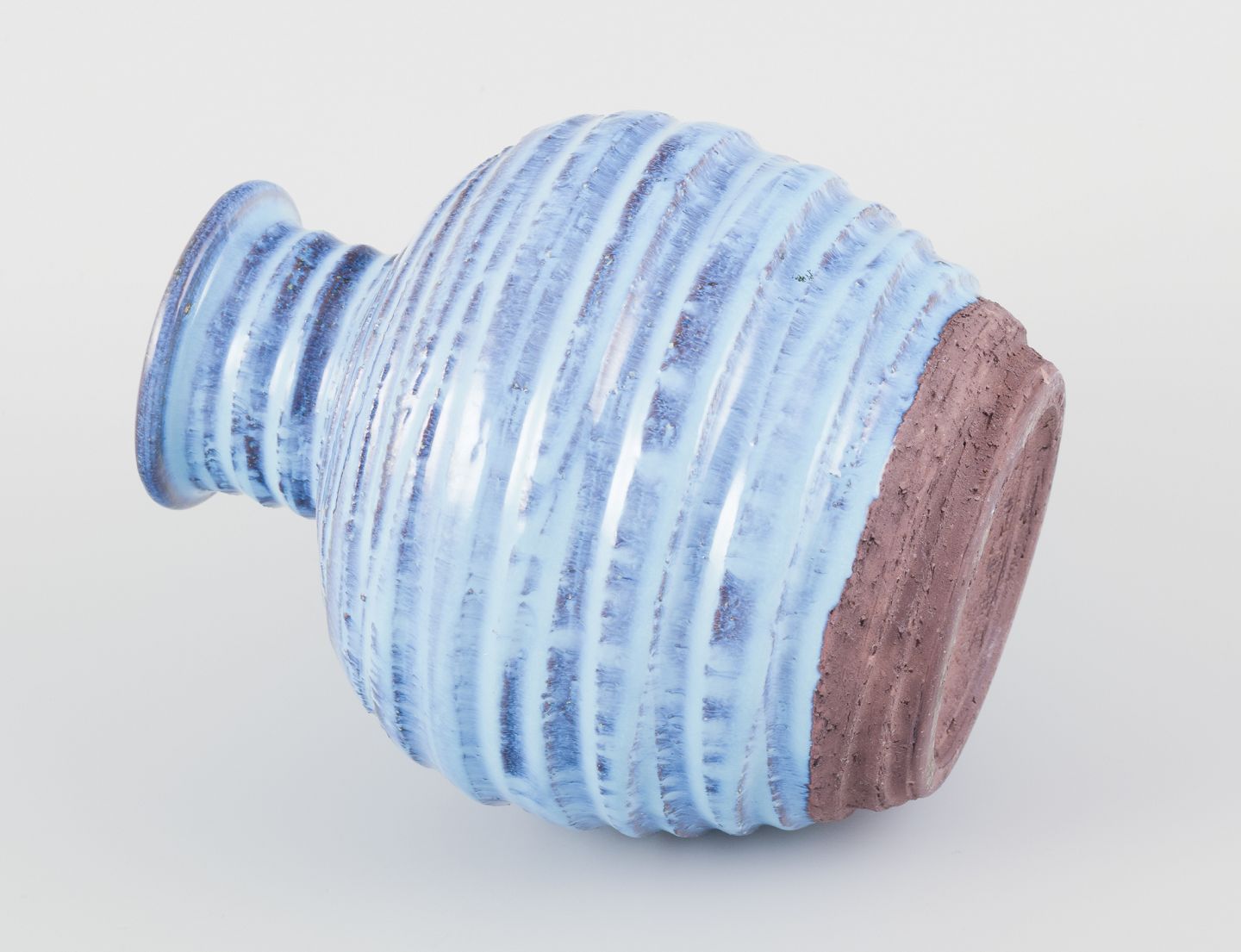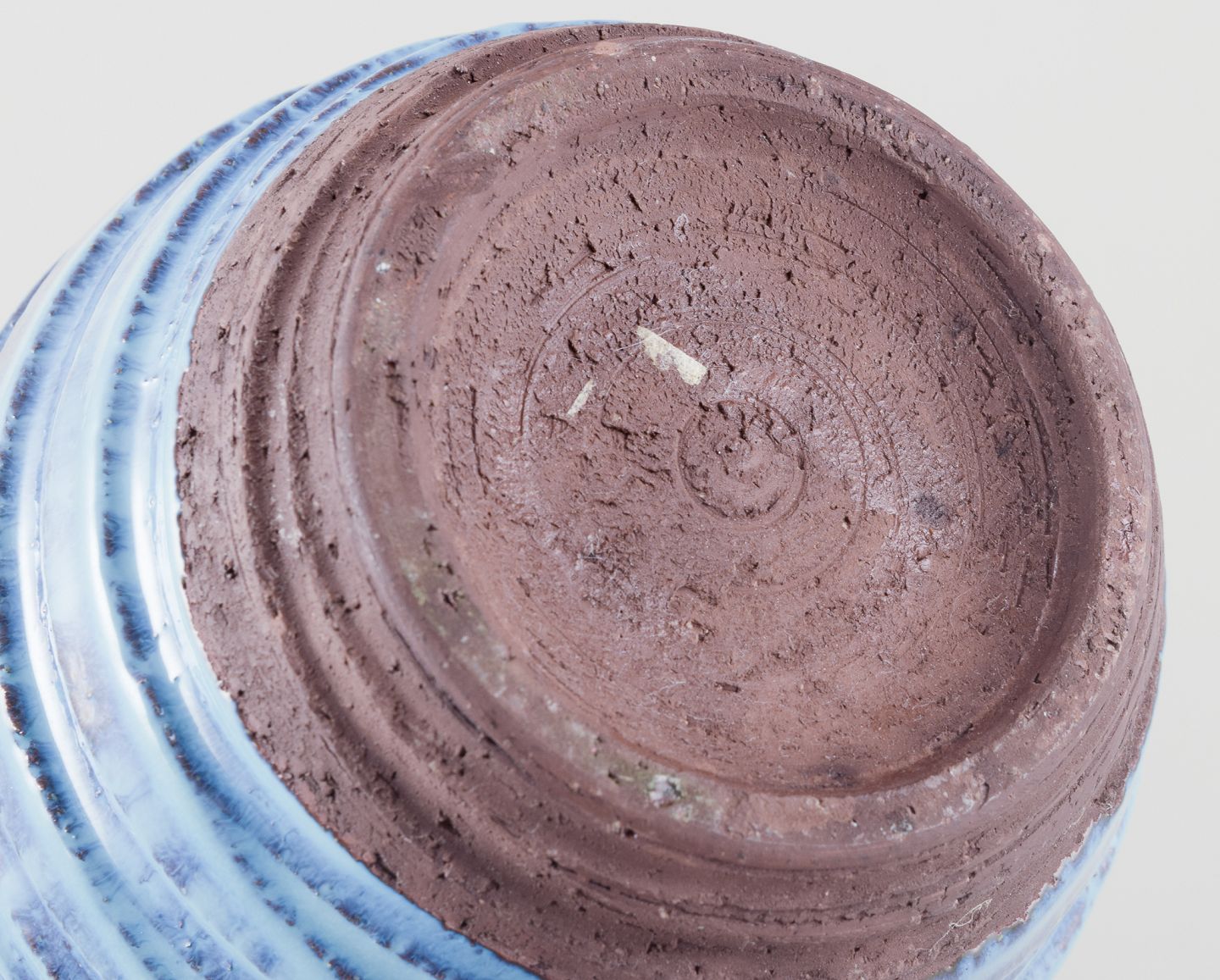 Glasur i lyseblå og lilla nuancer, uglaseret bund.