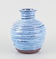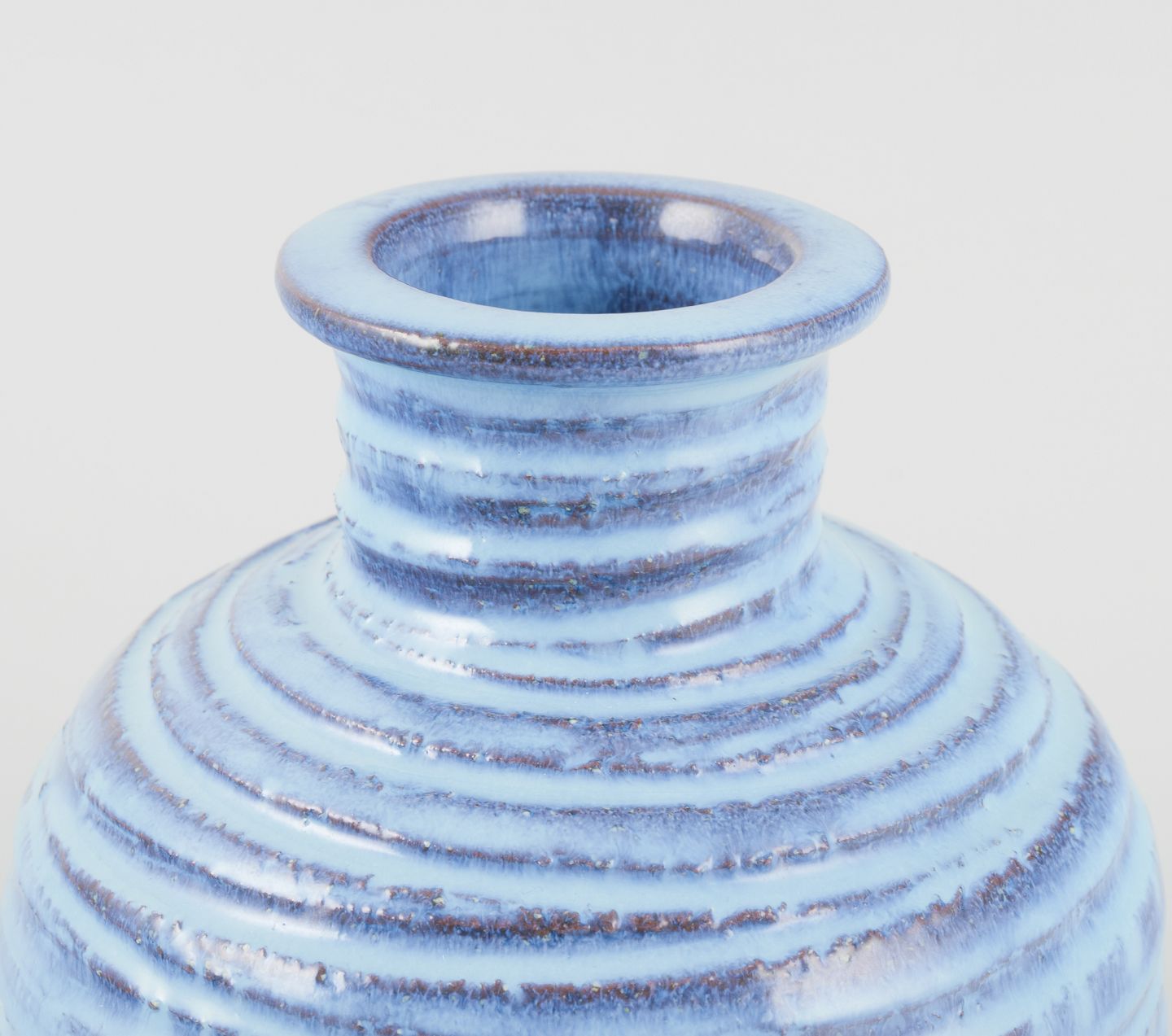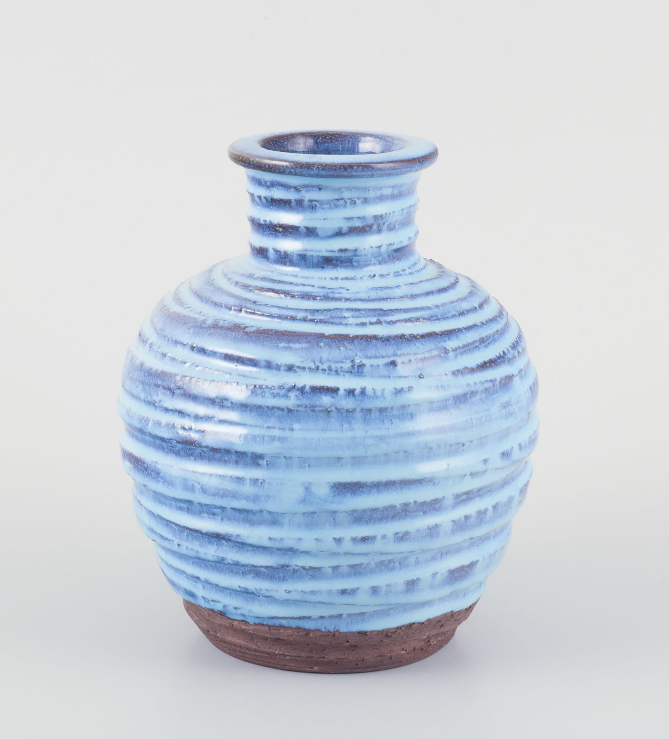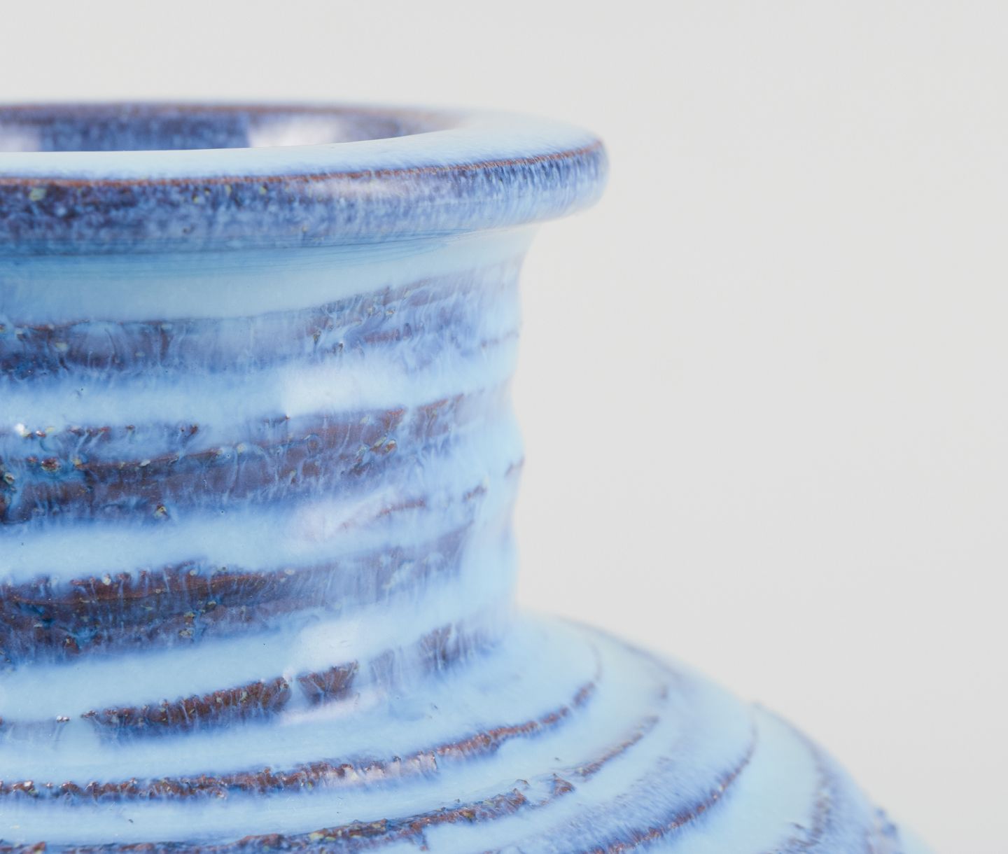 Glasur i lyseblå og lilla nuancer, uglaseret bund.