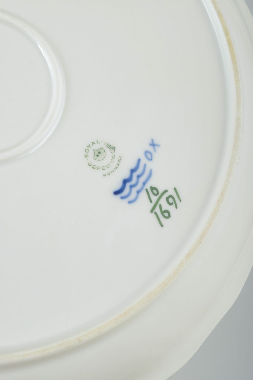 Stempel: Tre bølgelinjer, malerinitialer, model- og dekornummer. 1. sortering.