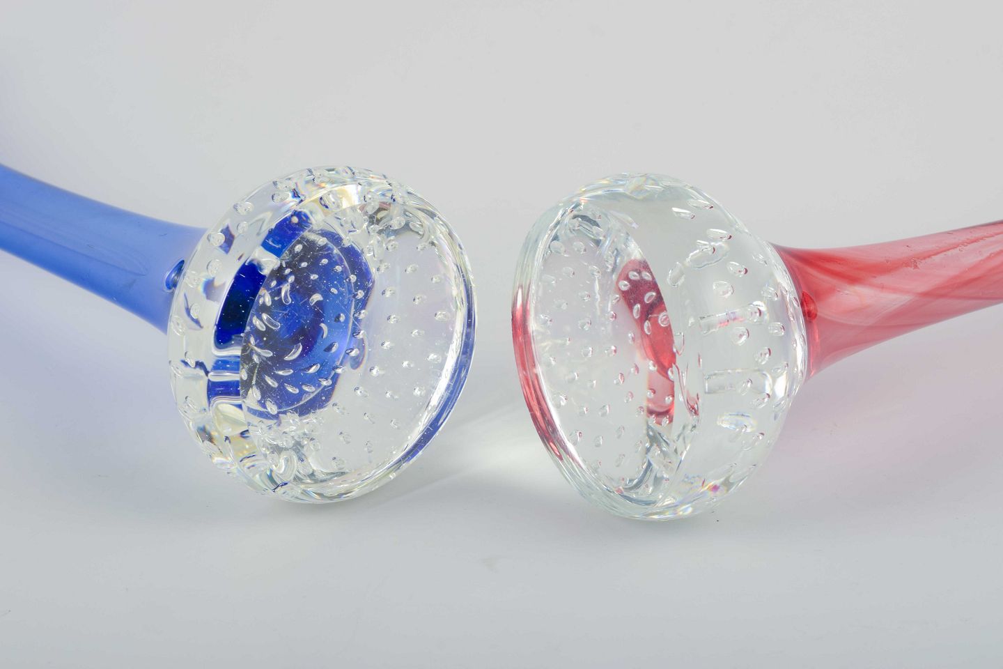 Et sæt dekorative glasvaser, én i blå og én i rød glasmasse, med højt slankt korpus og foldet åbning. Basen udført i klart glas med indfangede bobler (controlled bubbles). Fremstillet i Sverige, 1960–70’erne.
