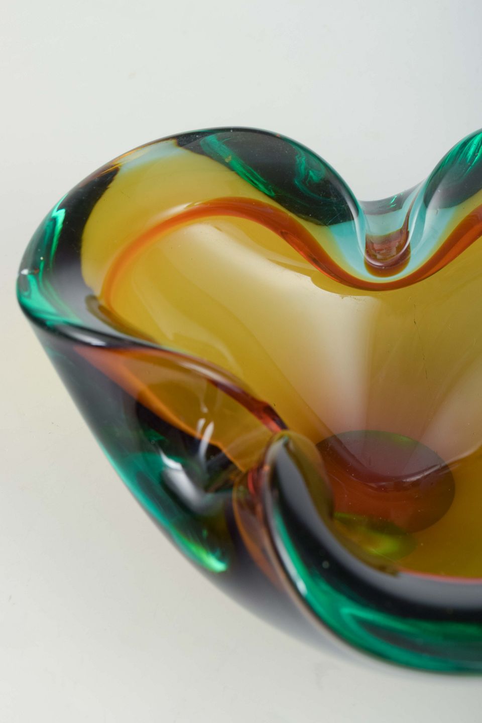 Organisk formet skål i flerfarvet glas med grønne, ravgule og rubinrøde nuancer udført i sommerso-teknik.