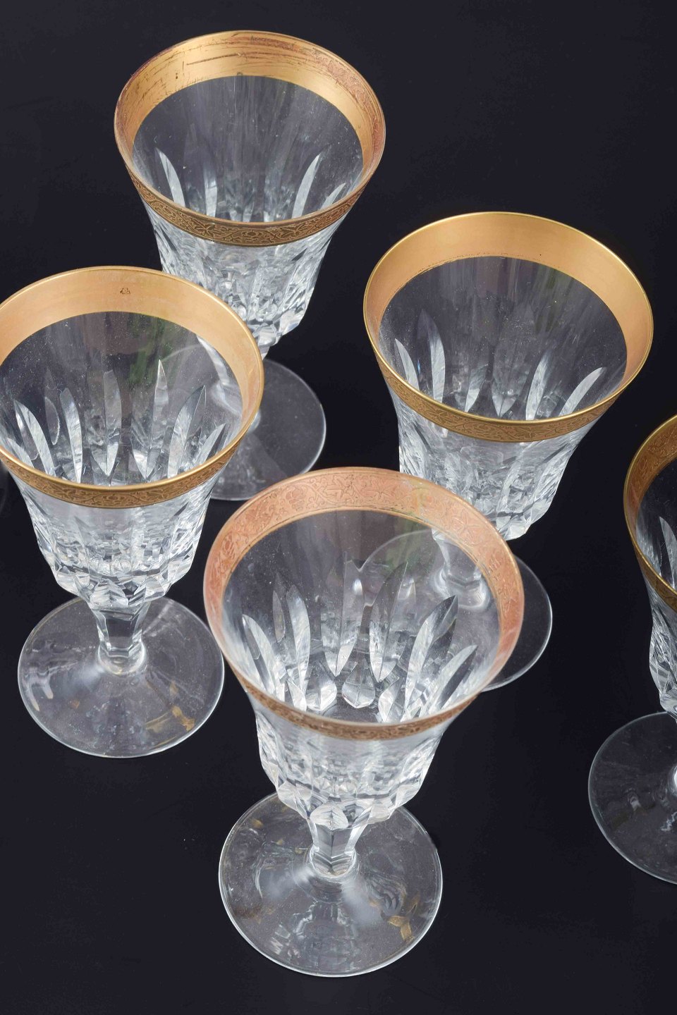 Fem krystalglas med guldbelagt rand, midt 1900-tallet.