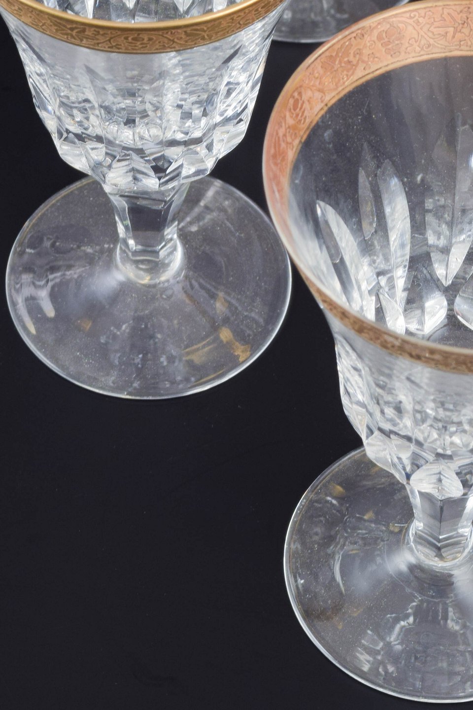 Facetslebne krystalglas på balusterfod, afsluttet med bredt guldbelagt bånd med indgraveret dekor i form af stiliserede blomster- og rankemønstre. Denne type glas var populære i midten af 1900-tallet, hvor krystal med forgyldte detaljer blev anset som både festlige og repræsentative og ofte indgik i komplette services til vin og likør.