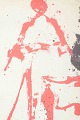 Farvelitografi i rød og sort.