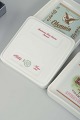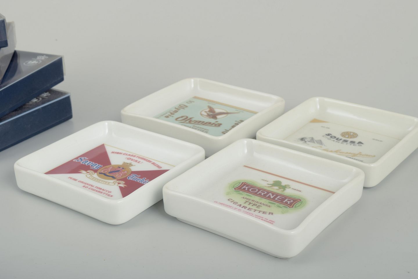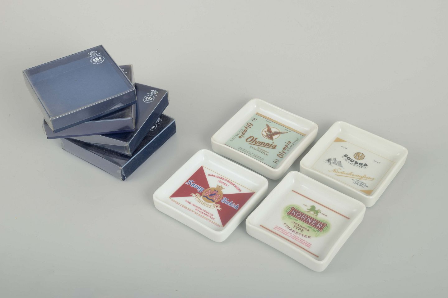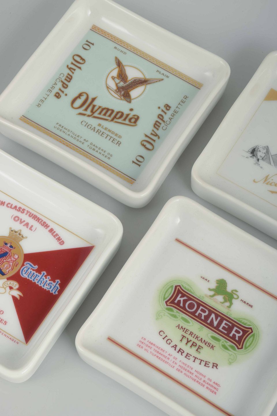 Sæt med fire kvadratiske porcelænsaskebægre, hver dekoreret med klassiske tobaks- og cigarmotiver: Olympia Cigarillos, Kornerup Cigarer, Handelsgold Cigarillos og Senator Brasil. Leveres i originale æsker.
