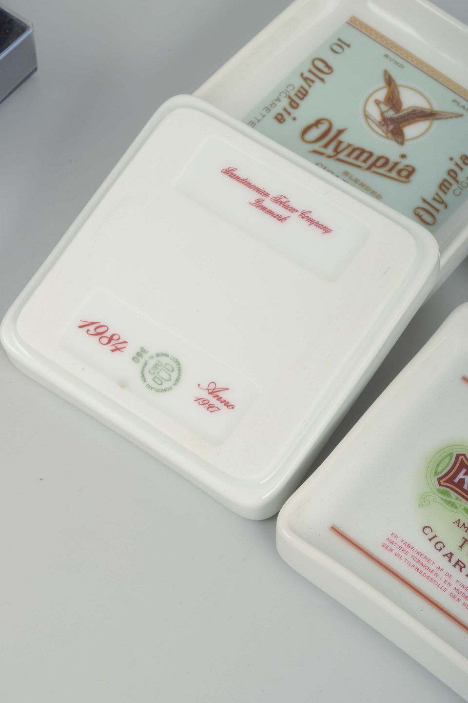 Bing & Grøndahl, grundlagt i København i 1853, er kendt for sit fine porcelæn og sine populære samlerobjekter. I 1980’erne producerede fabrikken også små serier af dekorative brugsgenstande, herunder askebægre med reklame- og tobaksdekorationer. Disse fire eksemplarer afspejler både porcelænskunstens kvalitet og tidens grafiske udtryk. Efter fusionen med Den Kongelige Porcelænsfabrik i 1987 blev Bing & Grøndahl en del af Royal Copenhagen, hvilket gør sådanne genstande til særligt interessante samlerobjekter i dag.