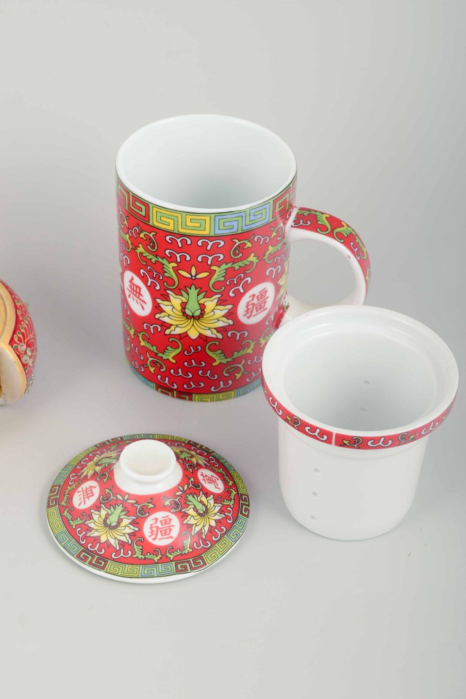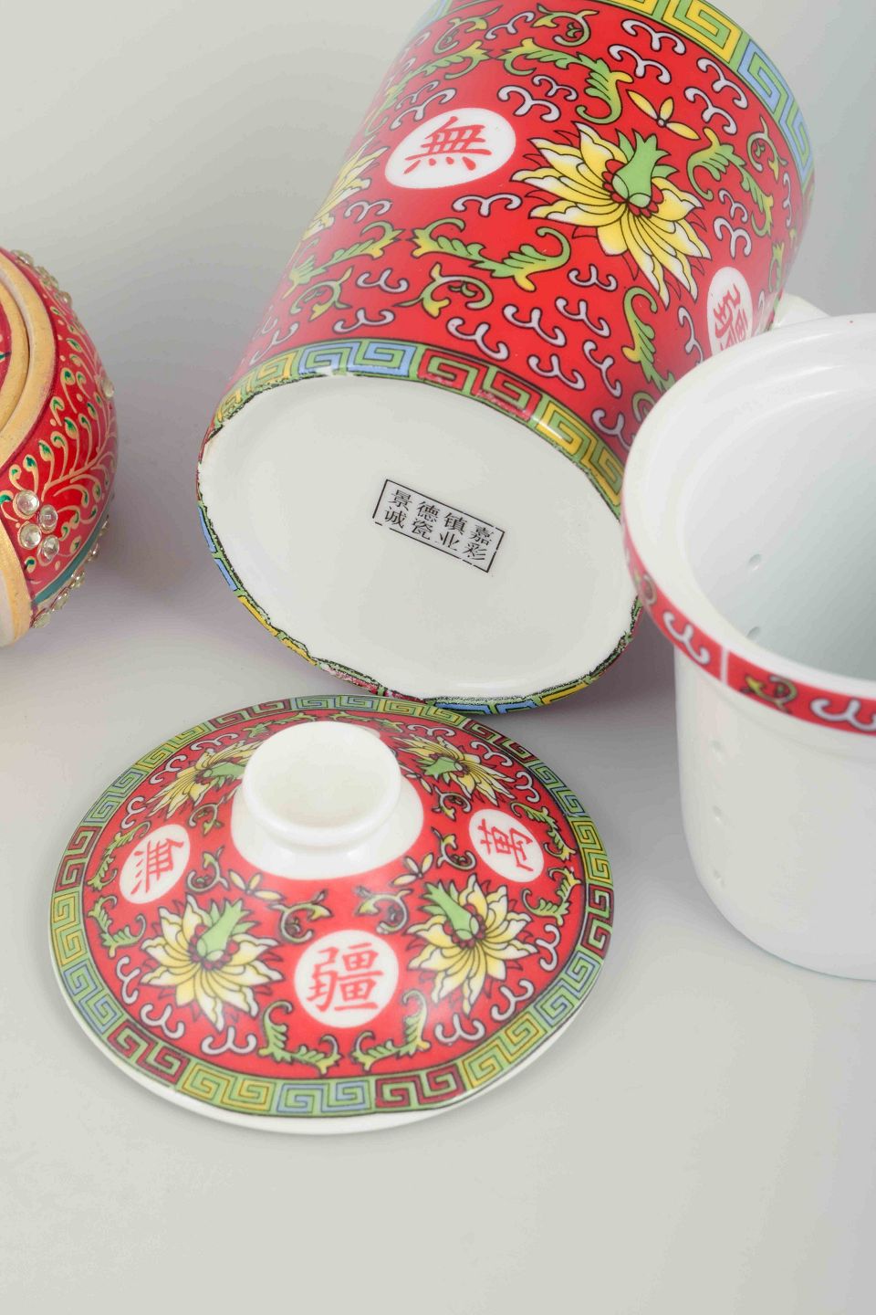 Cylindrisk krus med hank og låg, dekoreret i rød og flerfarvet famille rose-stil med blomster- og båndornamentik samt kinesiske skrifttegn. Hertil hørende seks runde flaske-/glasbakker i holder, dekoreret i matchende mønster.