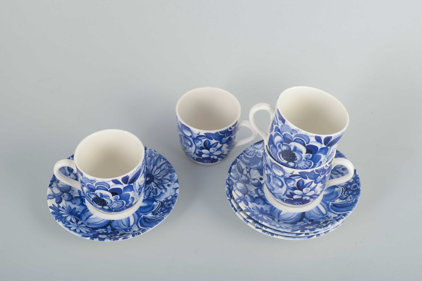 Porcelæn med håndmalet blomstermotiv i blå toner.