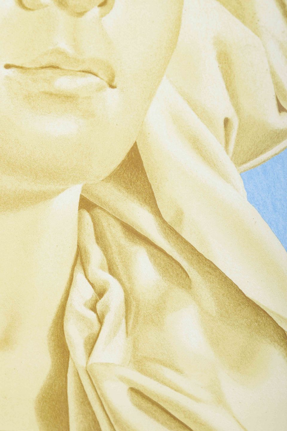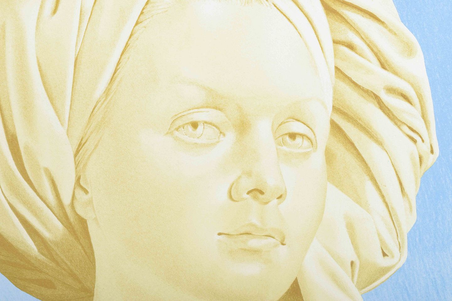 Et naturalistisk og minutiøst udført portræt af en kvinde med hovedklæde, sat mod en klar blå baggrund. Værket bærer Strøbeks karakteristiske superrealistiske stil, inspireret af 1600-tallets trompe-l’œil, hvor præcision og illusion skaber en nærmest fotografisk tilstedeværelse.