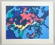 Et ekspressivt abstrakt tryk med organiske, farvemættede flader i blå, rød, grøn og gule nuancer. Kompositionen er præget af rytmiske bevægelser og kontraster, som skaber en levende og dynamisk billedflade, karakteristisk for Ernsts arbejde med farver og organiske udtryk.