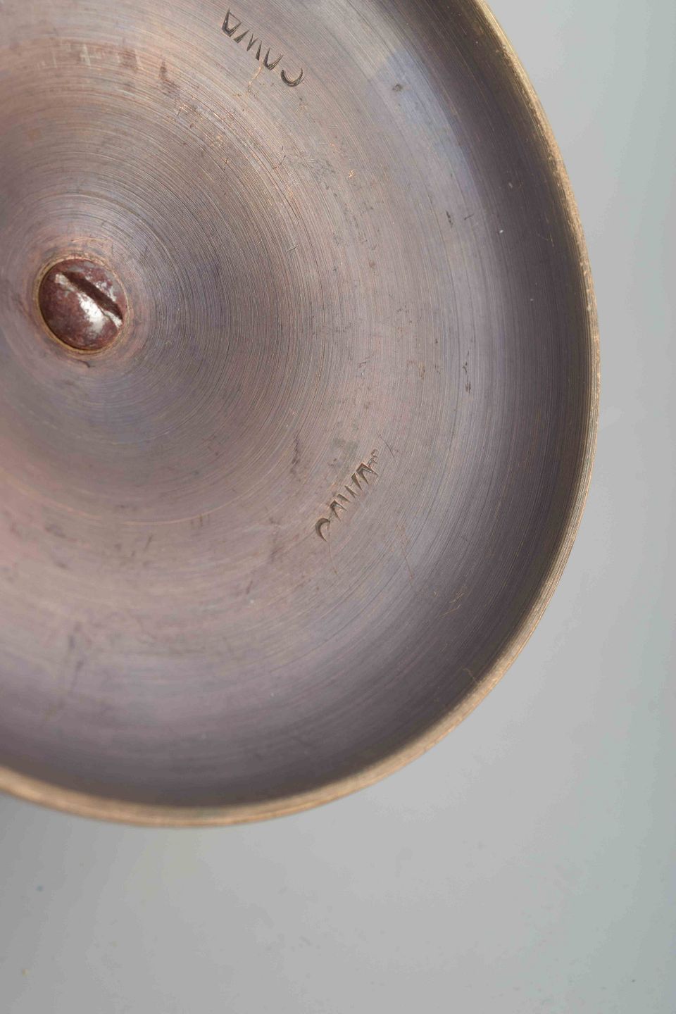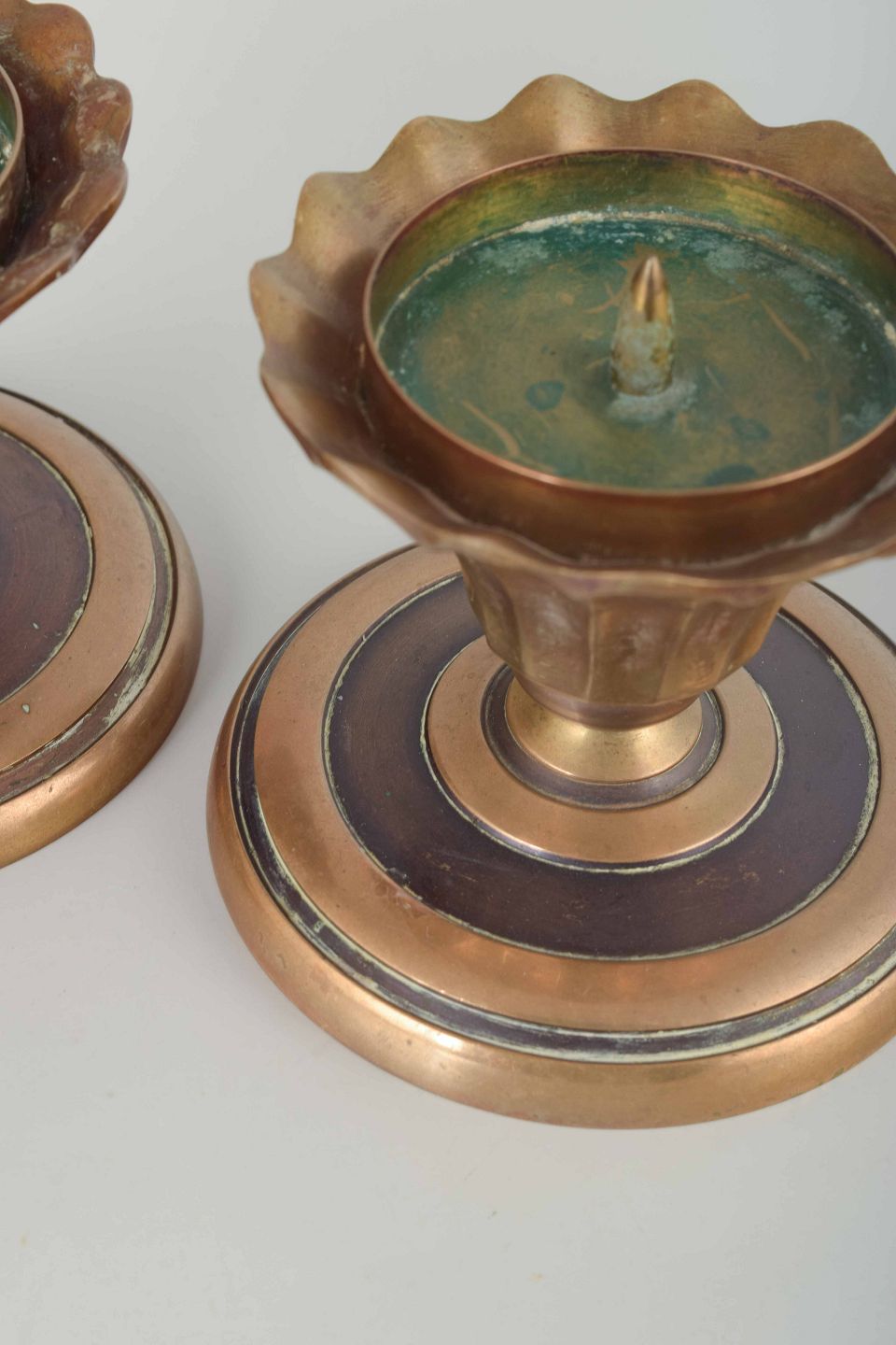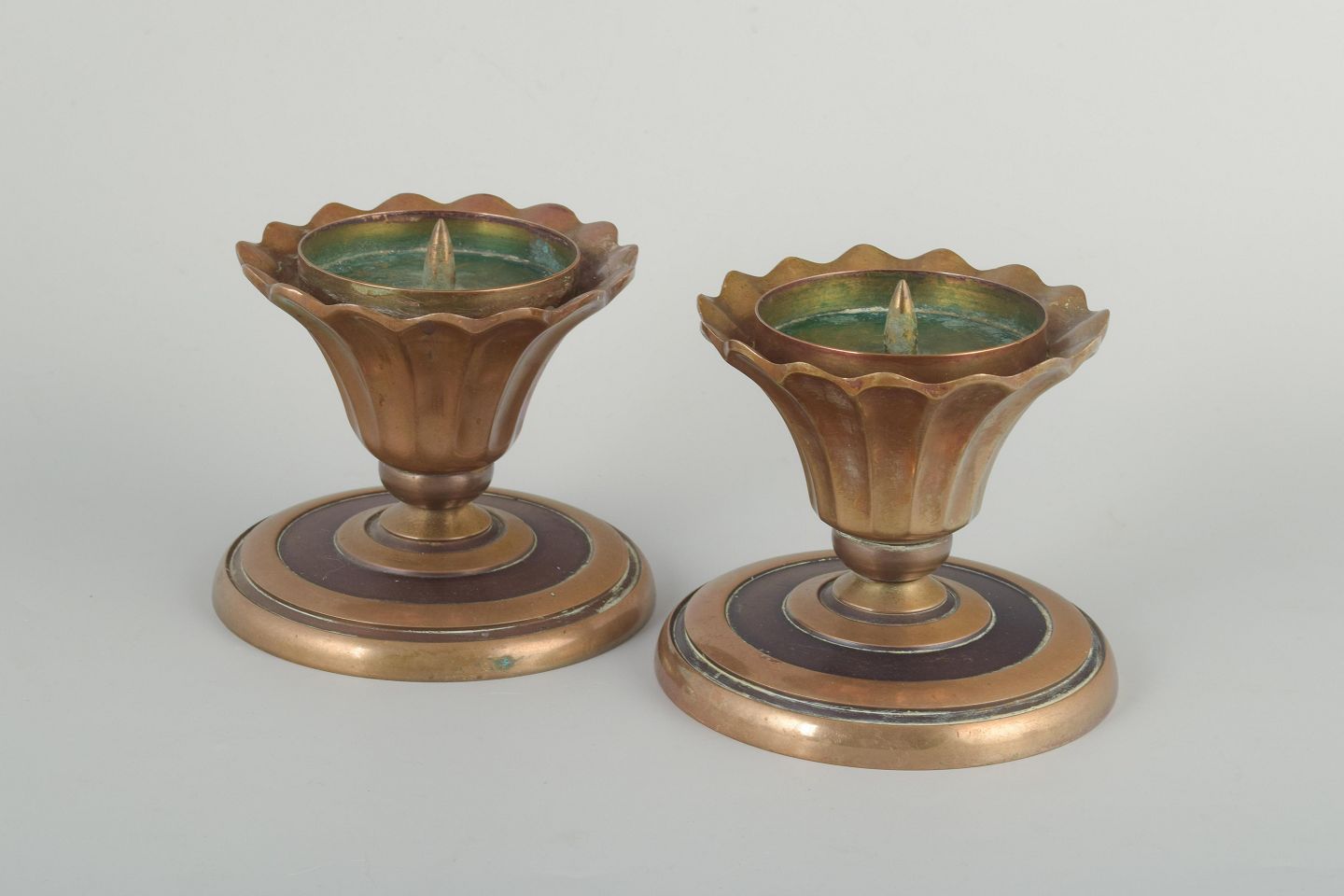 Massive messingstager med rund fod og geometriske ringdekorationer, typiske for perioden.