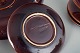 Tesæt i glaseret keramik i dyb bordeaux farve med karakteristiske hanke i forgyldt keramik. Bestående af tekande, fire kopper med underkopper samt fire tallerkener.