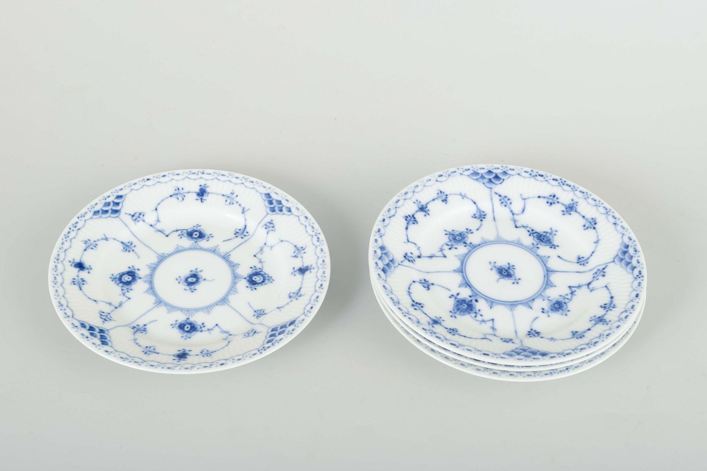 Fire tallerkener i porcelæn, håndmalet i det klassiske blå halvblonde mønster.