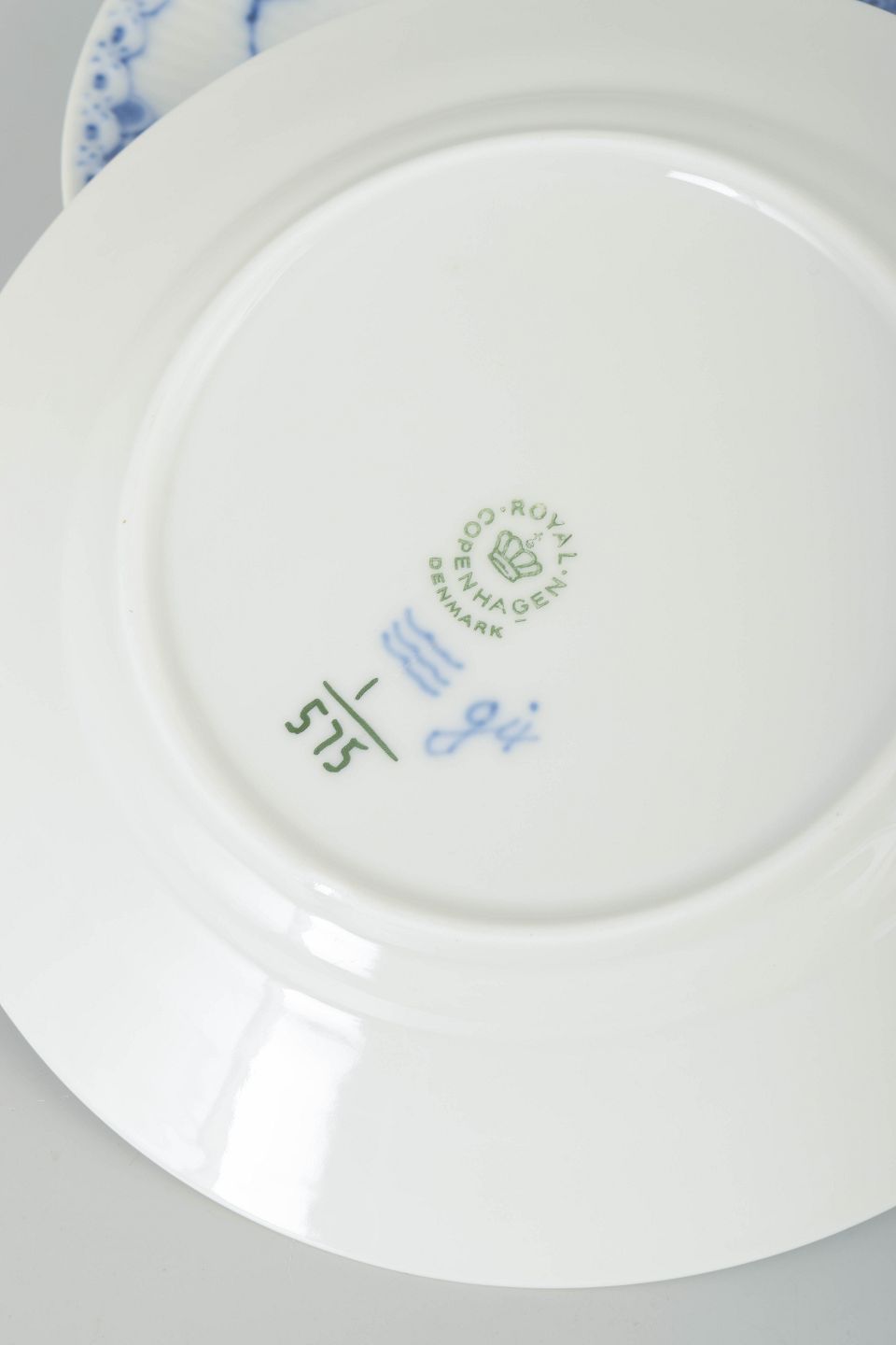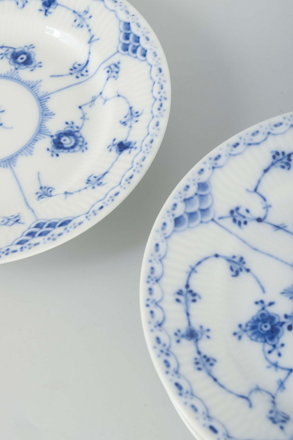 Musselmalet Halvblonde blev introduceret af Royal Copenhagen i 1888 som en videreudvikling af det klassiske Musselmalet Riflet. Dekorationen har en elegant gennembrudt blondekant og kombinerer tidløs dansk designtradition med raffineret håndværk. Tallerkener fra det 20. århundrede er populære både til brug og som samlerobjekter, da de repræsenterer en vigtig periode i dansk porcelænshistorie.