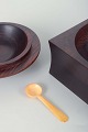 Elegant firkantet æske i eksotisk træ med buet låg og original ske i horn. Enkel og funktionel formgivning, karakteristisk for dansk design i 1960’erne.