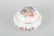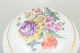 Elegant rund krukke i porcelæn med låg, dekoreret med håndmalede blomster i det klassiske “Sachsisk Blomst” mønster og guldkant.