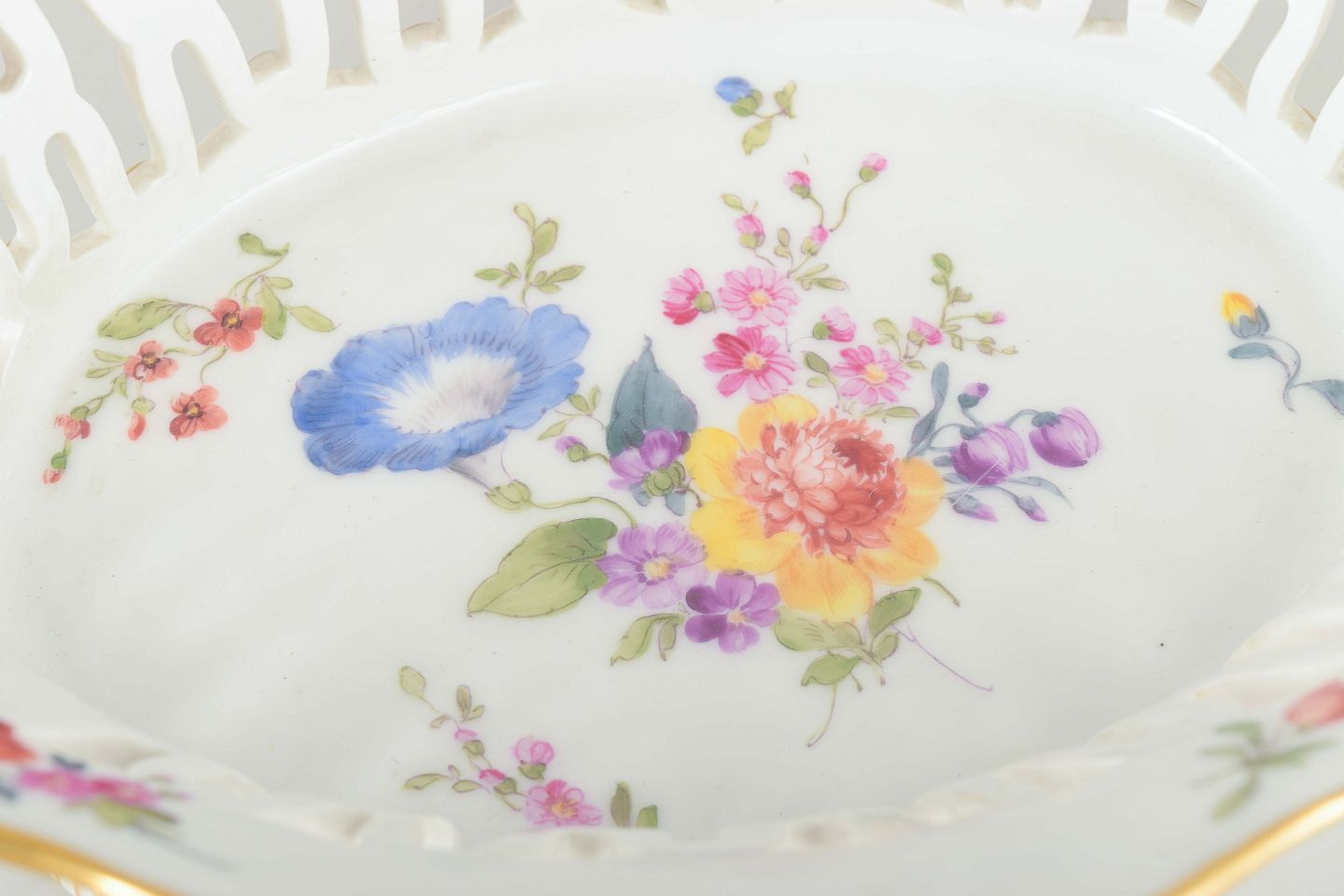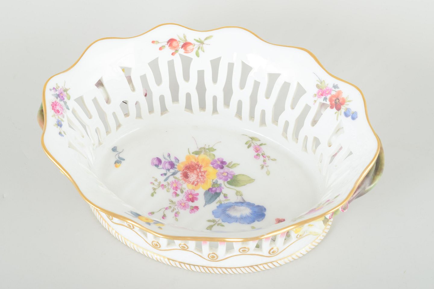 Stor oval gennembrudt skål i porcelæn dekoreret med håndmalede blomster i det klassiske “Sachsisk Blomst” mønster, forgyldte detaljer og plastiske blomsterapplikationer på siderne.