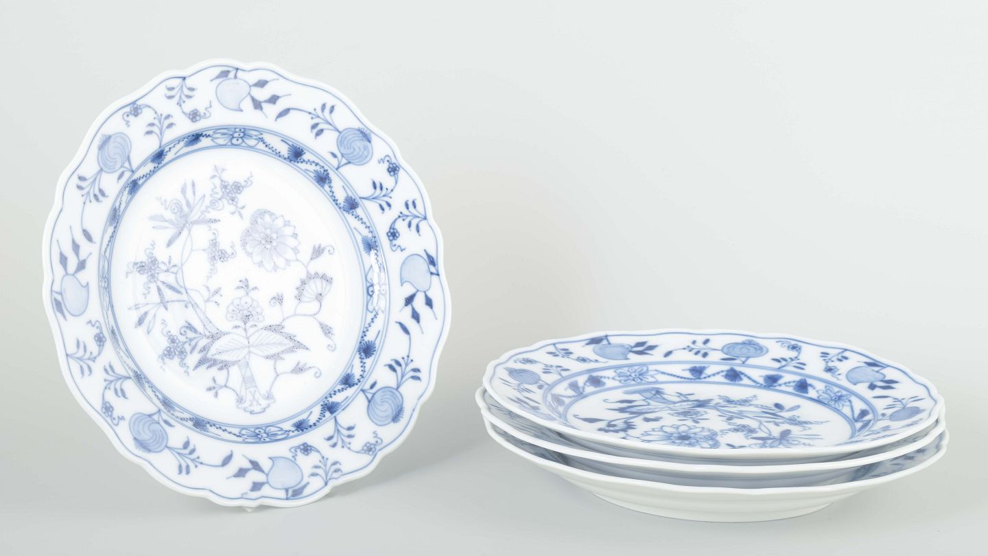 4 middagstallerkener, “Løgmønstret”, midten af 1900-tallet.