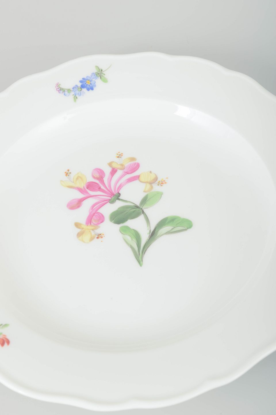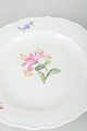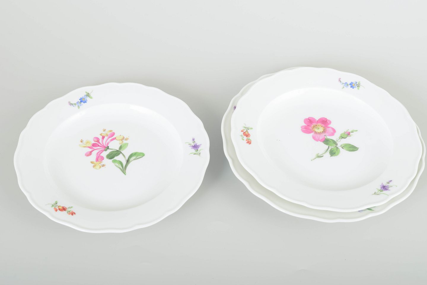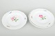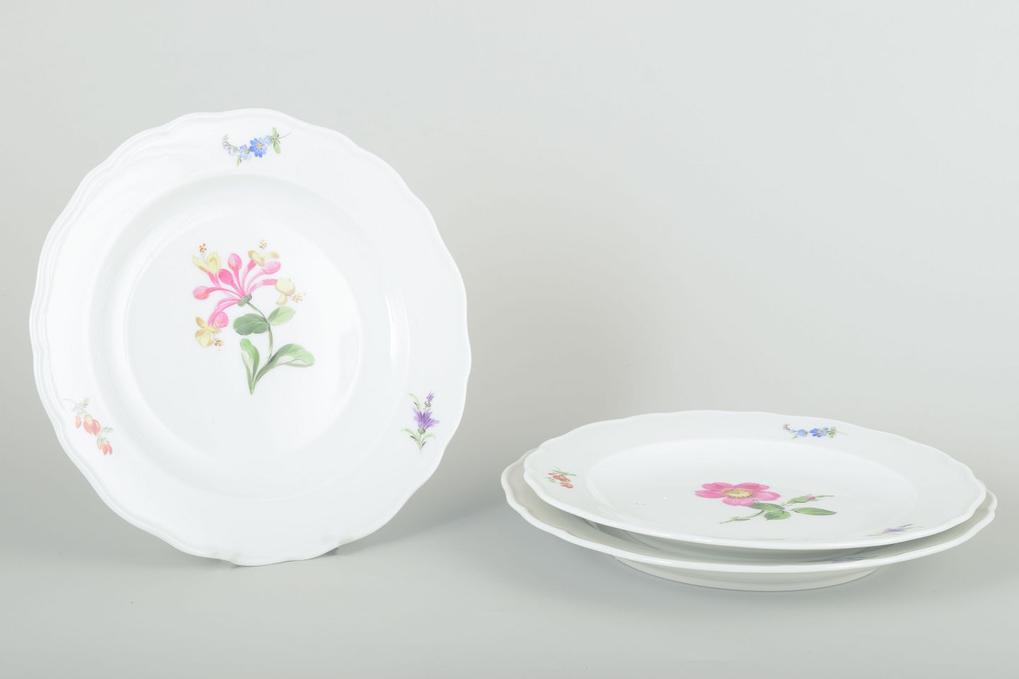 Tre tallerkener i porcelæn, håndmalede med blomsterdekorationer i flerfarvet palet. Klassisk bølget kantprofil med relief og delikat staffering.
