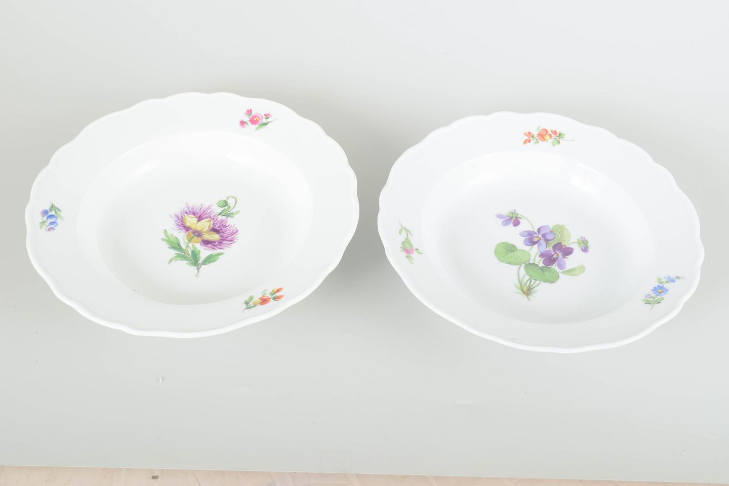 To dybe tallerkener i porcelæn, håndmalede med blomsterdekorationer i flerfarvet palet. Klassisk bølget kantprofil med relief og delikat staffering.