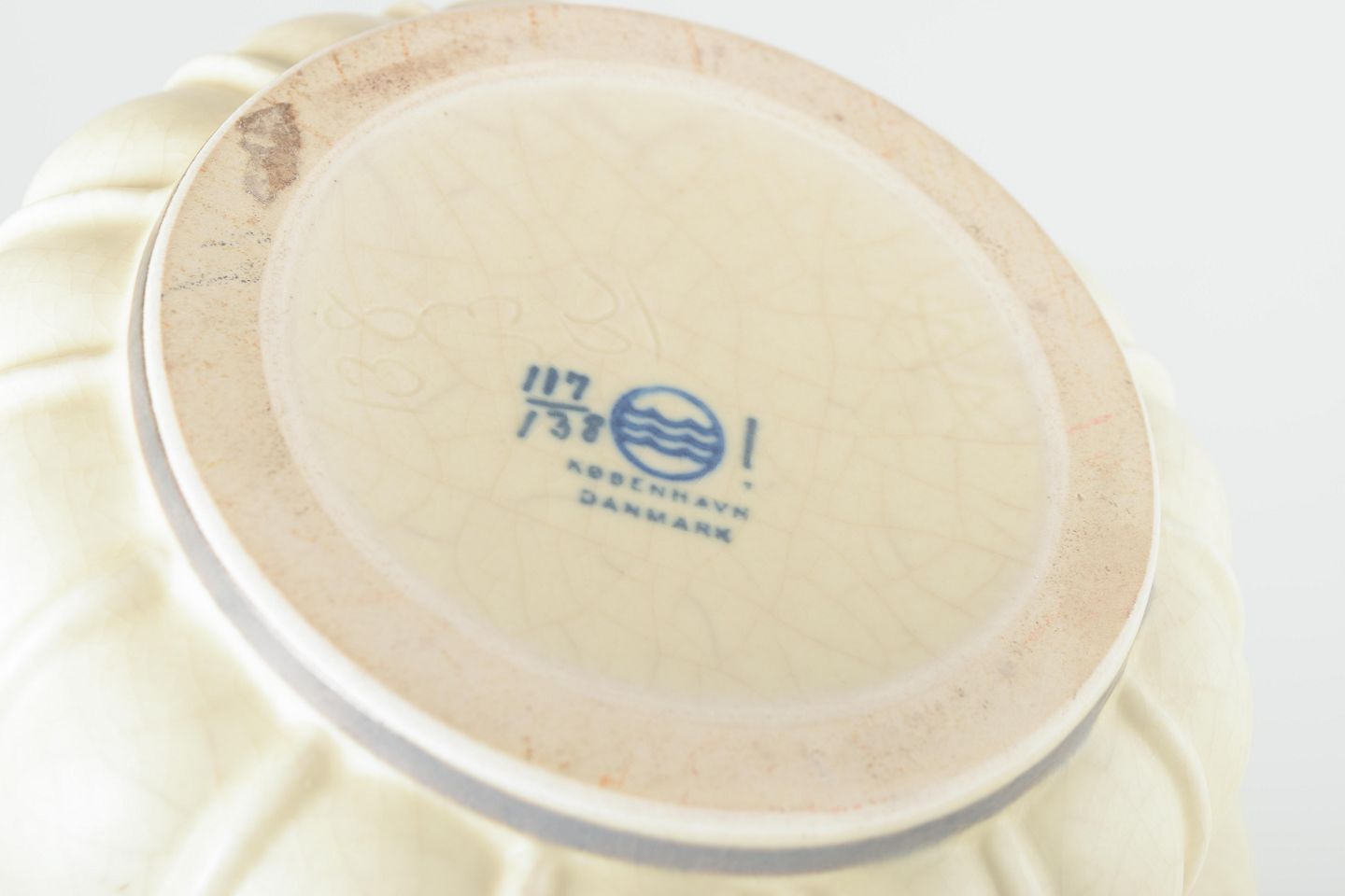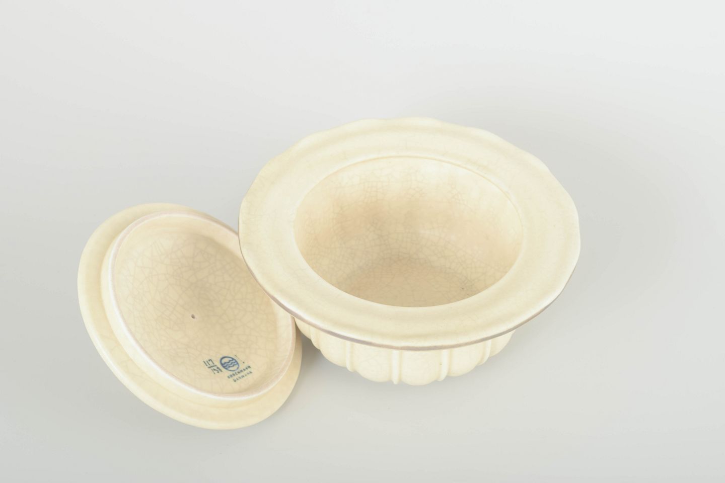 Art Deco lågkrukke i fajance med reliefdekoreret korpus og låg med figurativ knop forestillende abe. Glasur i klassisk cremefarvet craquelé med let violette skygger. Model nr. 117/138.