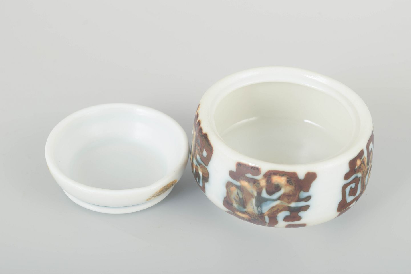 Lille lågkrukke i porcelæn med hvid glasur og abstrakt, reliefagtig dekoration i brunlige og turkise nuancer. Et sjældent og kunstnerisk studiostykke fra Royal Copenhagens eksperimenterende periode i 1960’erne, hvor fabrikkens designere arbejdede med nye glasur- og farveteknikker.