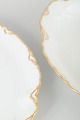 Elegant sæt ovale fade i cremefarvet porcelæn med håndmalet guldkant og svungne profilerede former. Klassisk fransk design i tidstypisk art deco-inspireret udtryk.