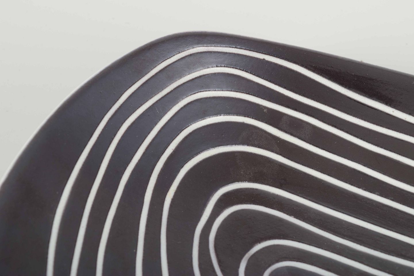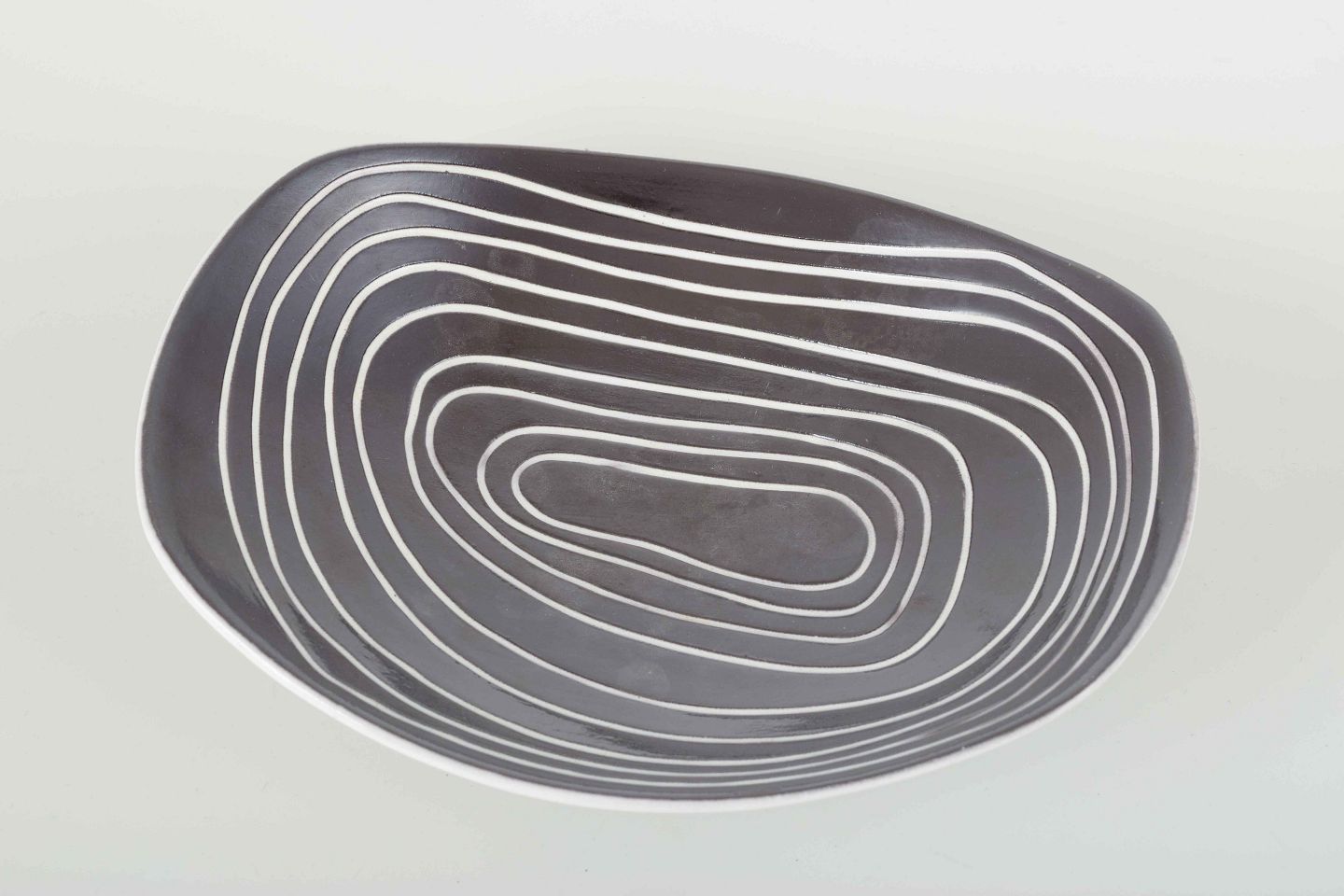 Asymmetrisk formet skål i fajance med hvid glasur udvendigt og mørkgrå glasur med hvide linjer indvendigt.