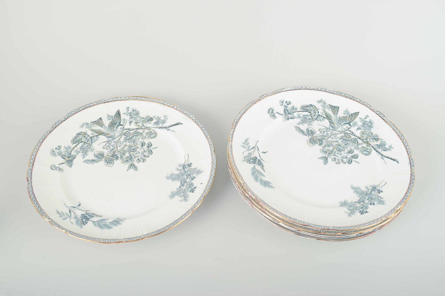 Fem middagstallerkener i fajance med dekoration af fugl og blomstergren i blågrønne nuancer samt dekorativ bort langs kanten.