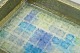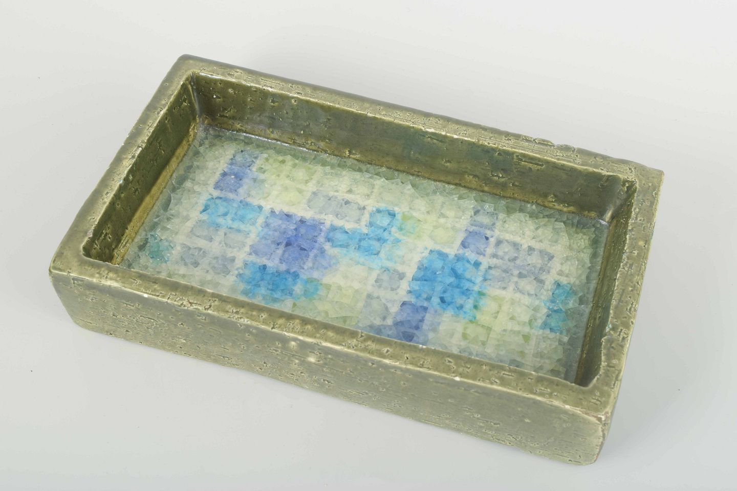 Stor rektangulær skål i stentøj med grønlig glasur og indvendig mosaikdekoration i blå og turkise nuancer. Et karakteristisk eksempel på Bitossis kunstkeramik fra 1970’erne med arkitektonisk form og levende glasurspil.