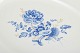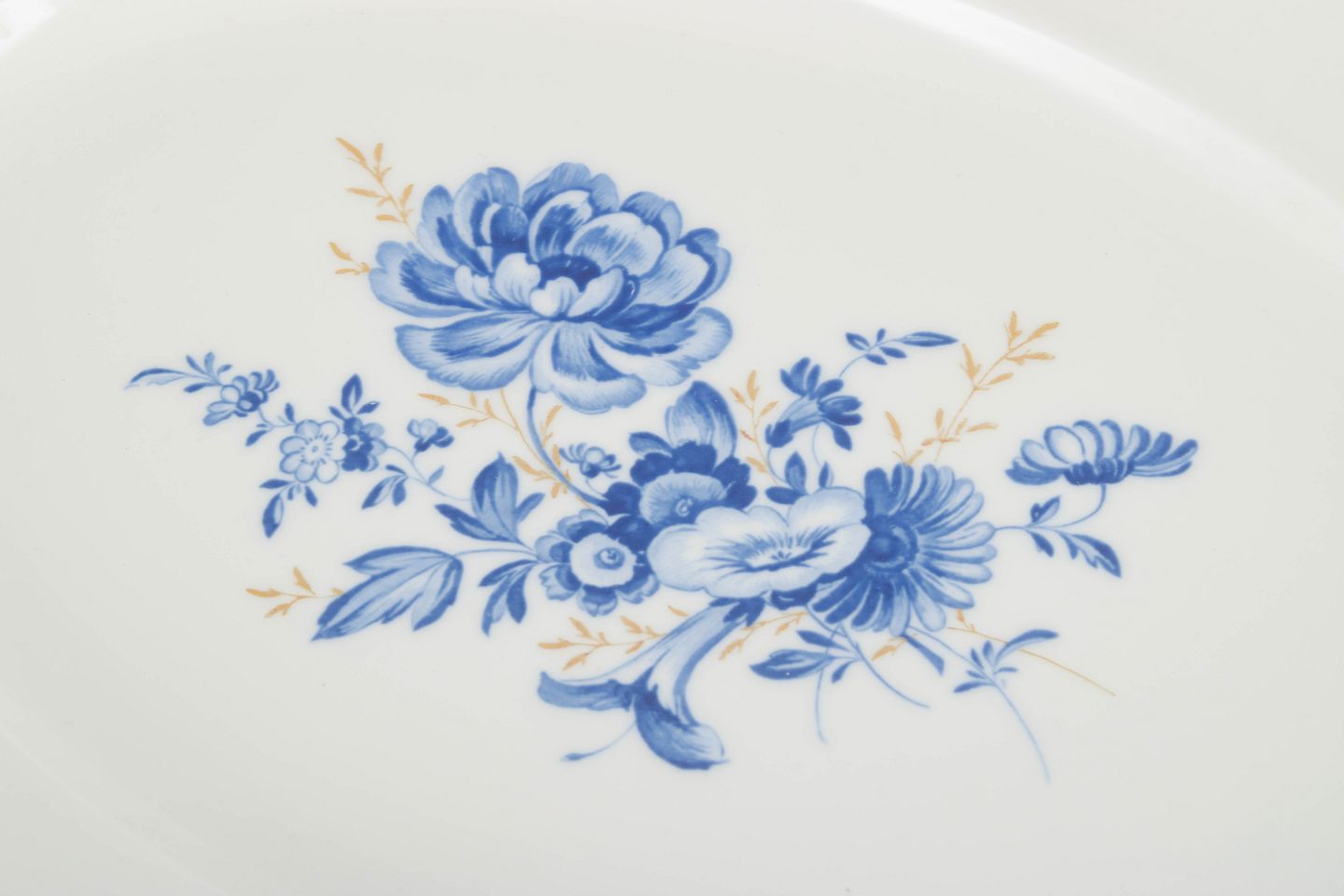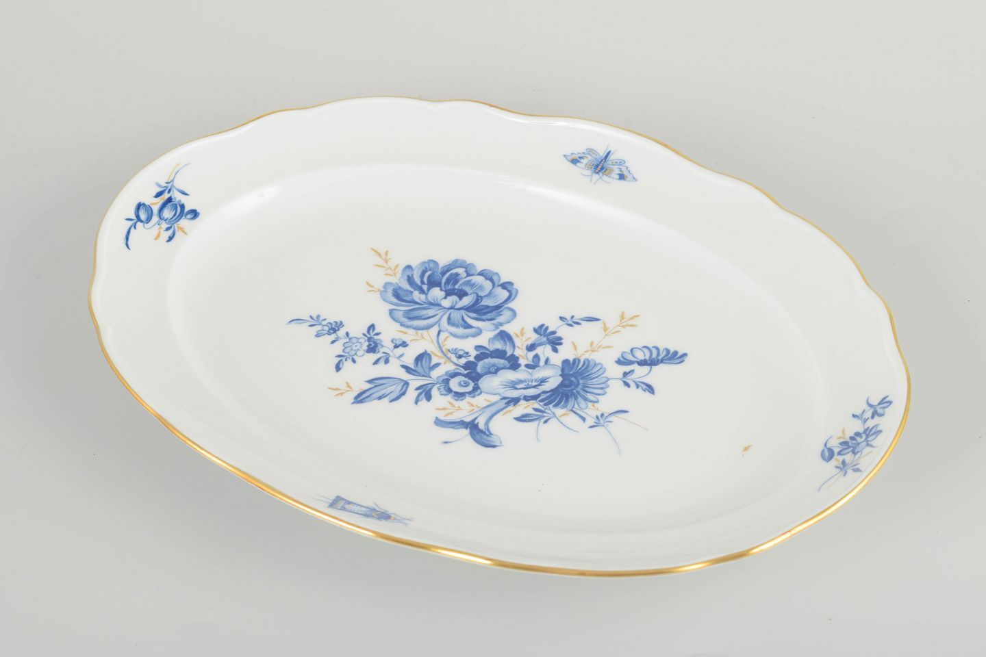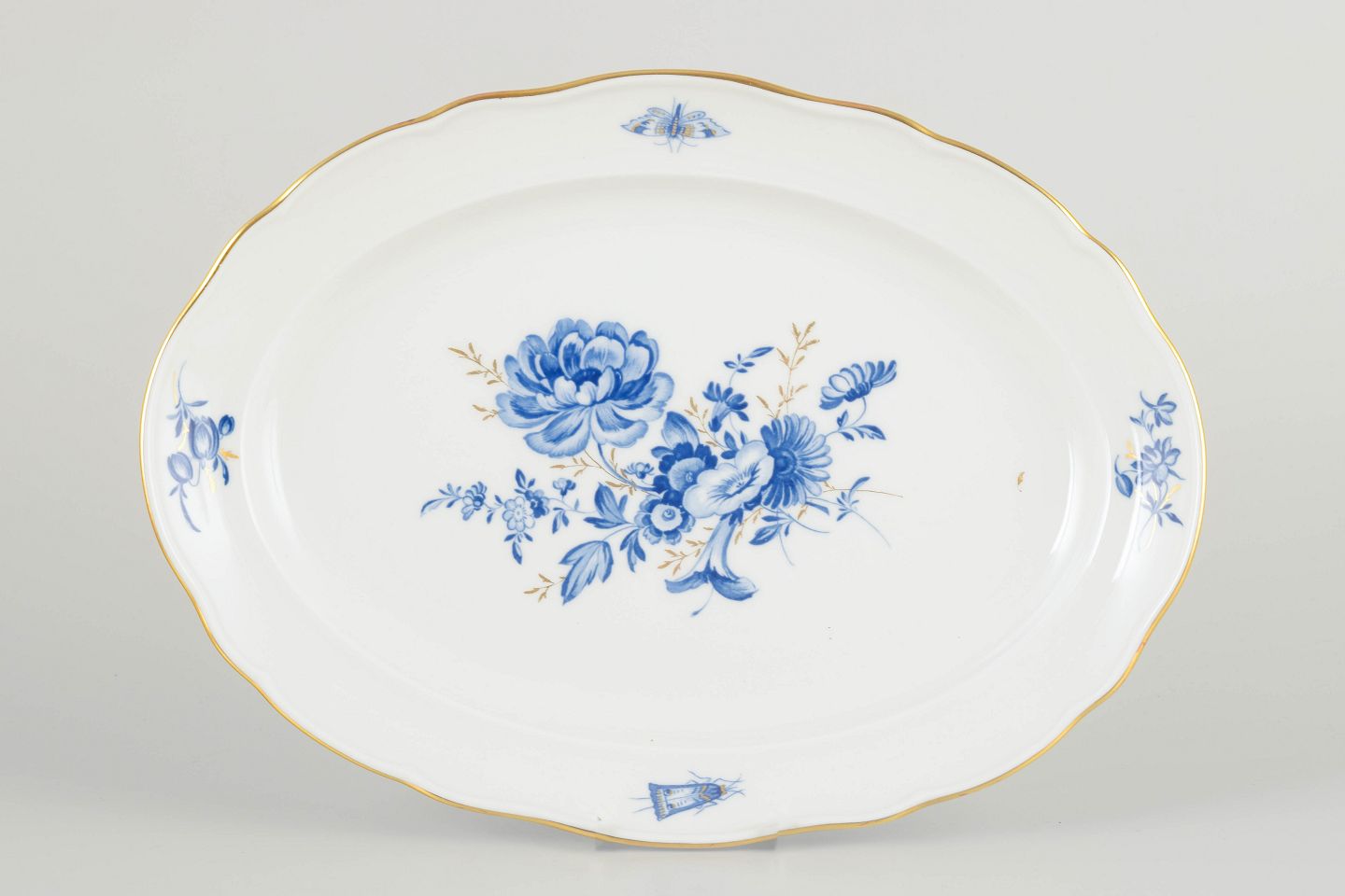 Hånddekoreret porcelæn med håndmalede blå blomsterdekorationer og forgyldte stafferinger langs den svungne kant. Klassisk oval form med let hævet spejl og fint modellerede detaljer.