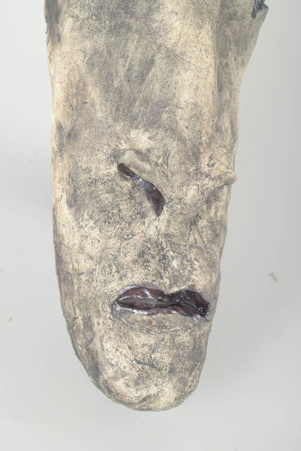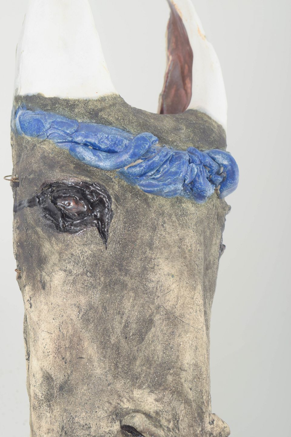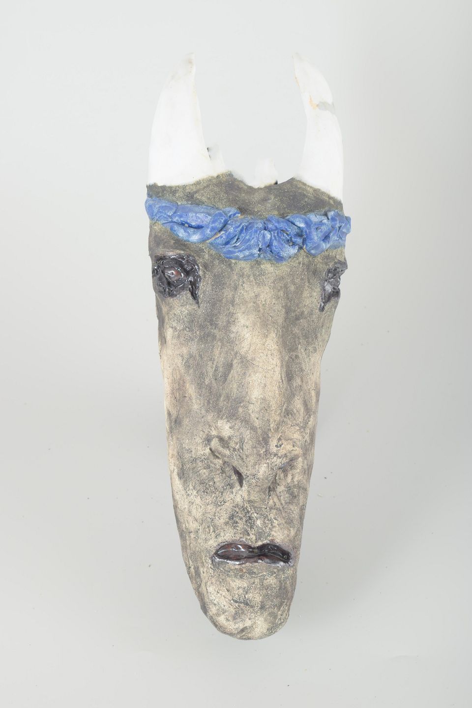 Unik, håndmodelleret skulptur i stentøj med rå overflade i gråtoner, dekoreret med blå glasurbånd og hvide hornlignende former. Et ekspressivt og figurativt værk med stærk personlig karakter.