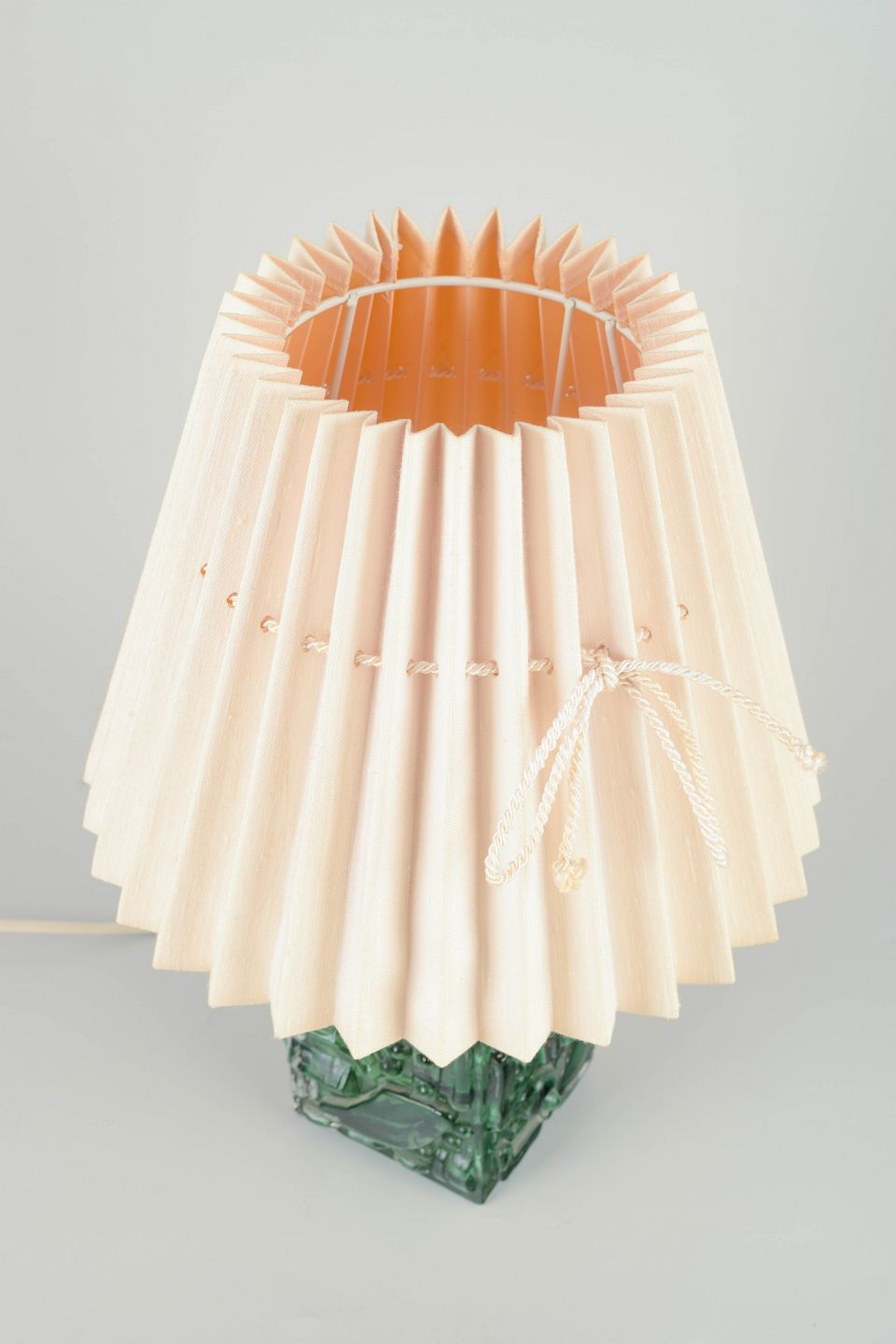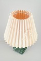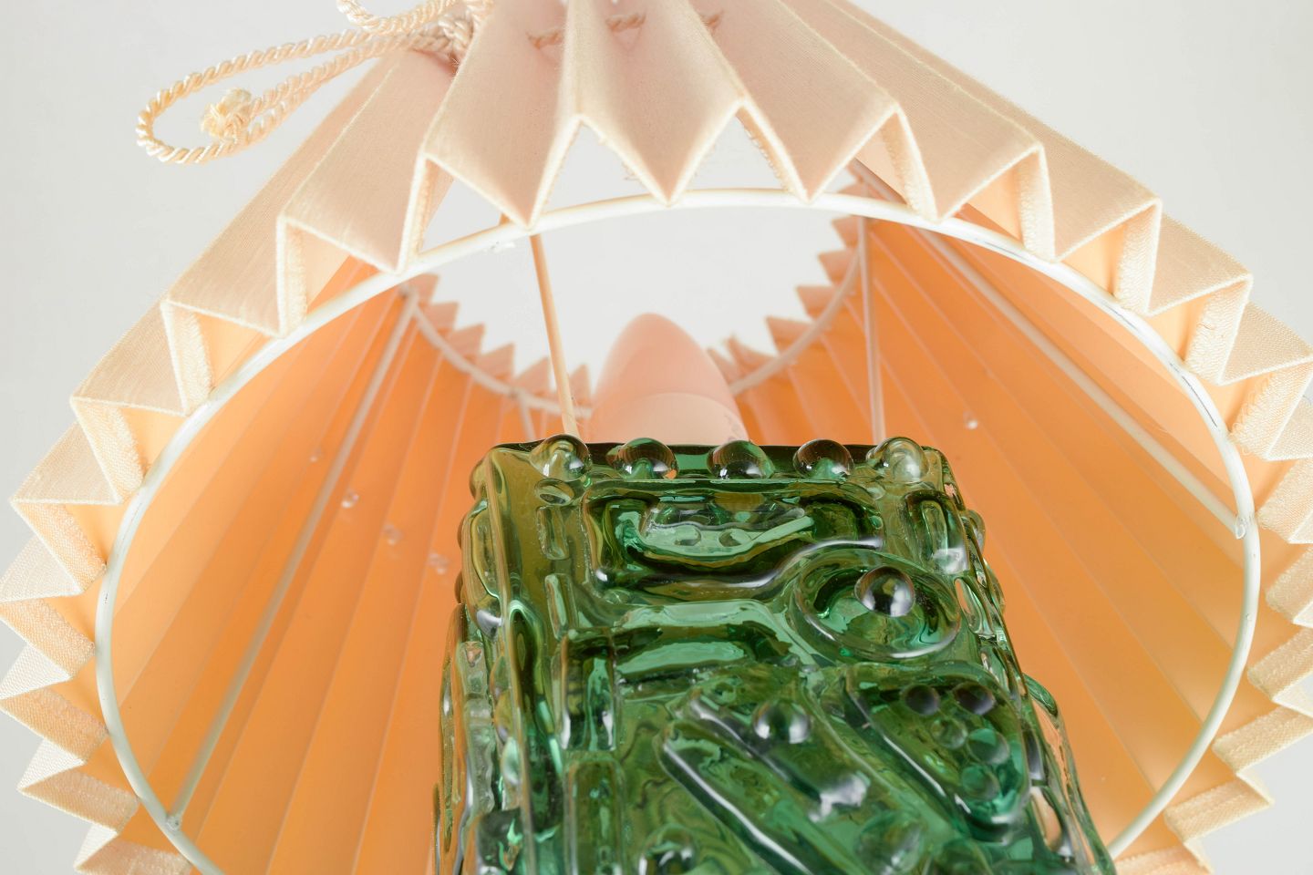 Rektangulær lampefod i kraftigt formblæst grønt glas med reliefdekorerede abstrakte mønstre og optiske effekter. Monteret med plisseret stofskærm.