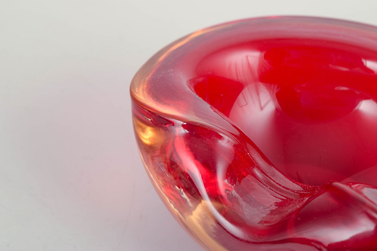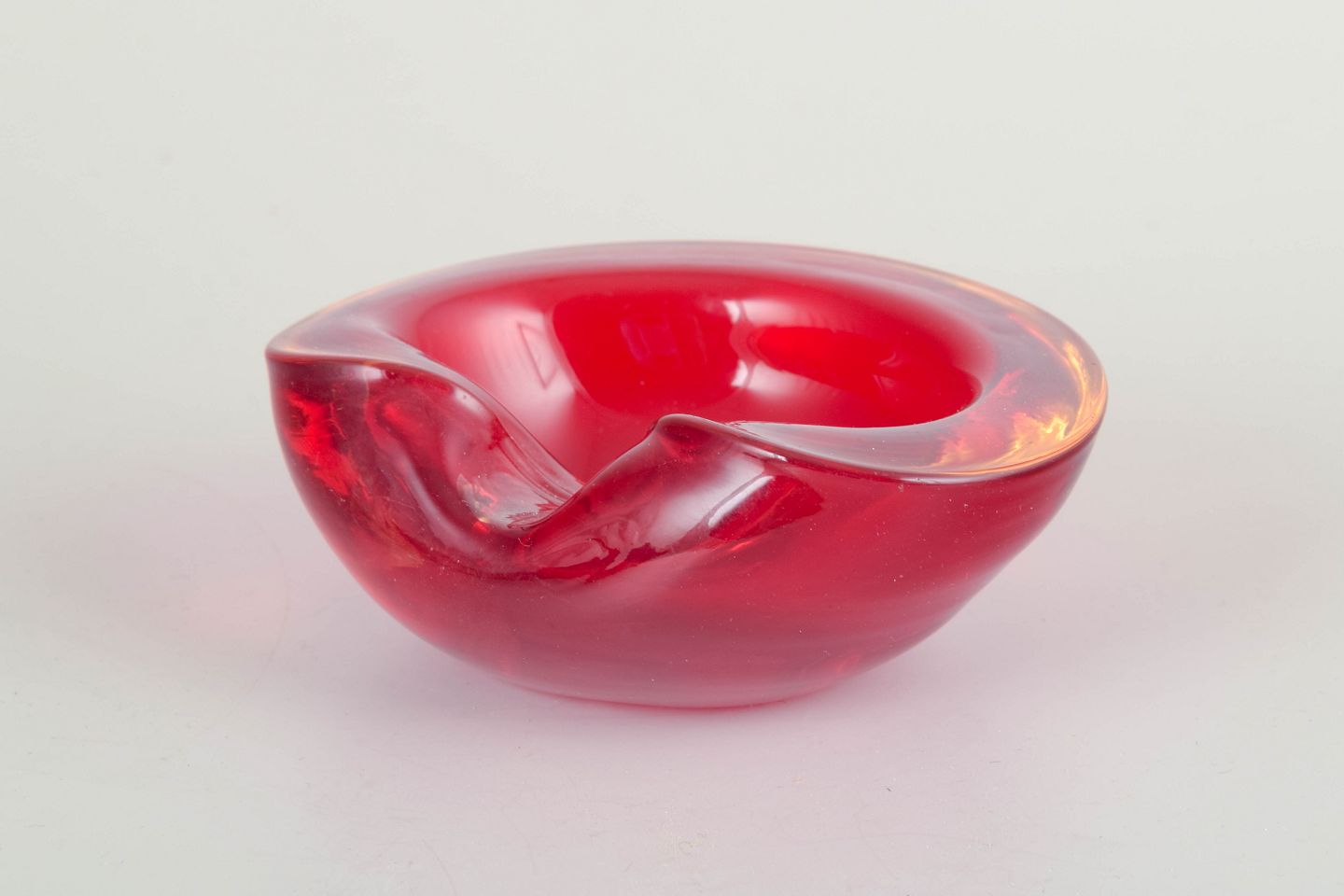 Organisk fritformet mundblæst skål i intens rubinrød sommerso-glas med blødt indfoldet rand og svævende klarhedsdybde — et klassisk eksempel på studioglas fra Murano.