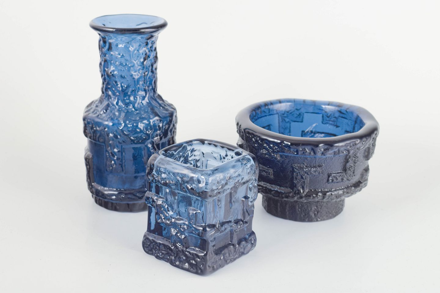 Mundblæste, skulpturelle glasvaser i dyb kobaltblå farve med markant isstruktur/relief — én høj cylindrisk vase, én firkantet og én skålformet. Et karakteristisk brutalistisk udtryk fra Ruda Glasbruk i 1970’erne.