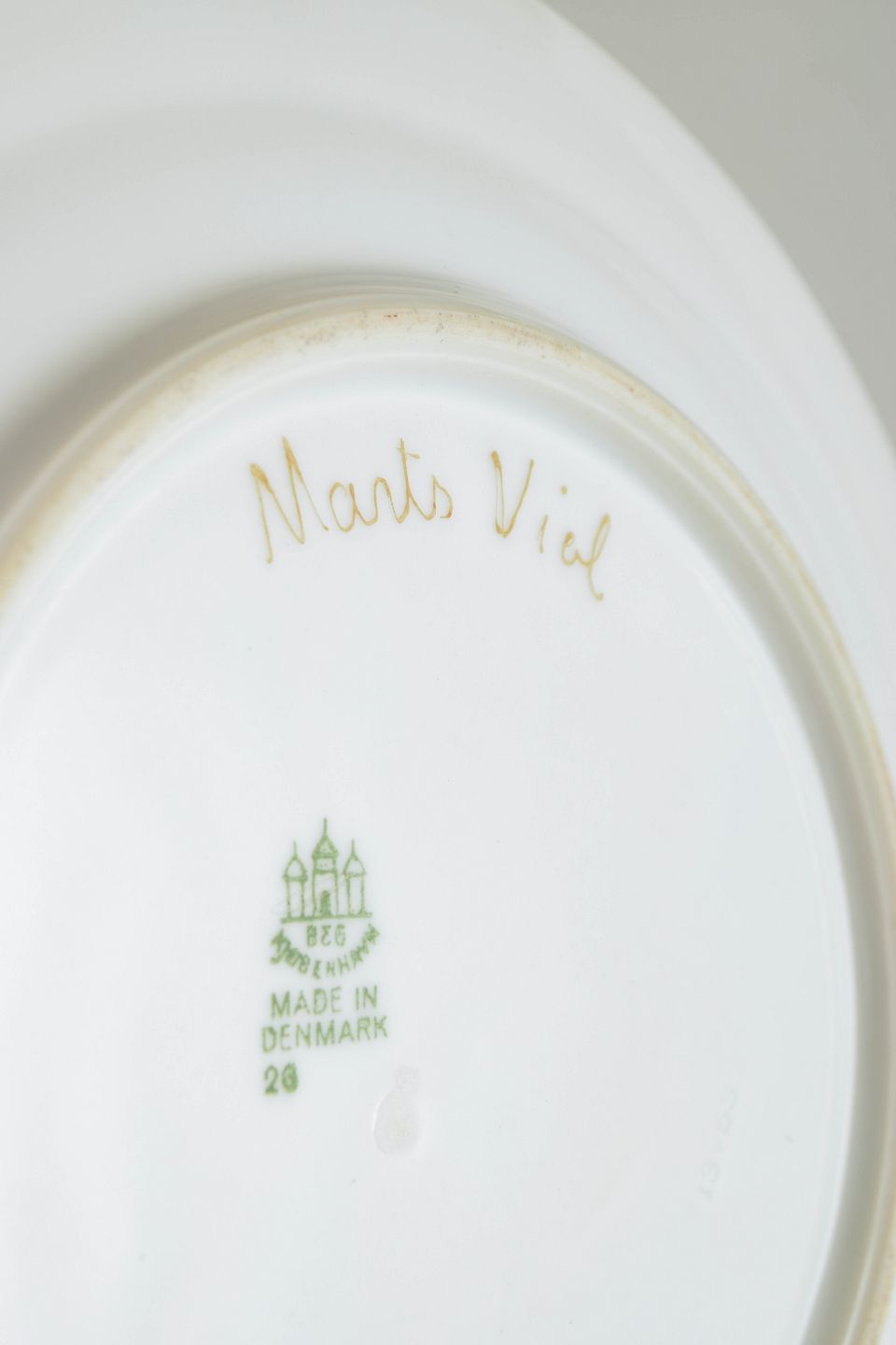 To porcelænstallerkener med håndmalede botaniske motiver og guldbemaling langs kanten. 2. sortering.