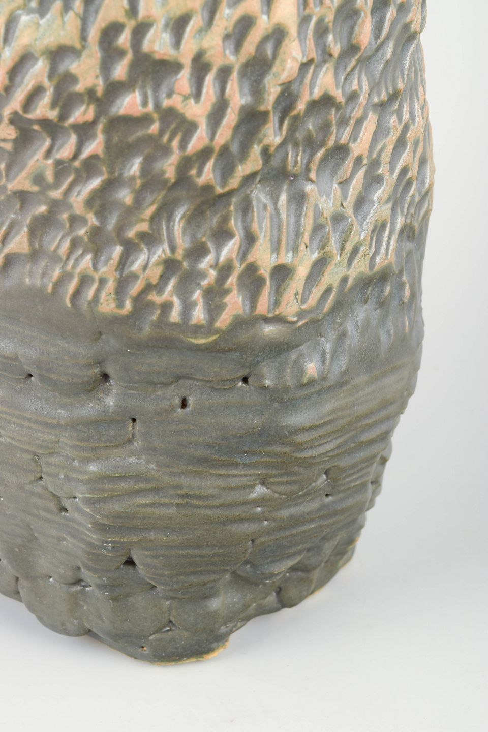 Stor, skulpturel gulvvase i håndformet stentøj med rå, kraftigt tekstureret overflade og reliefornamentik i beige og lyse rosa toner mod mørk grålig korpus.