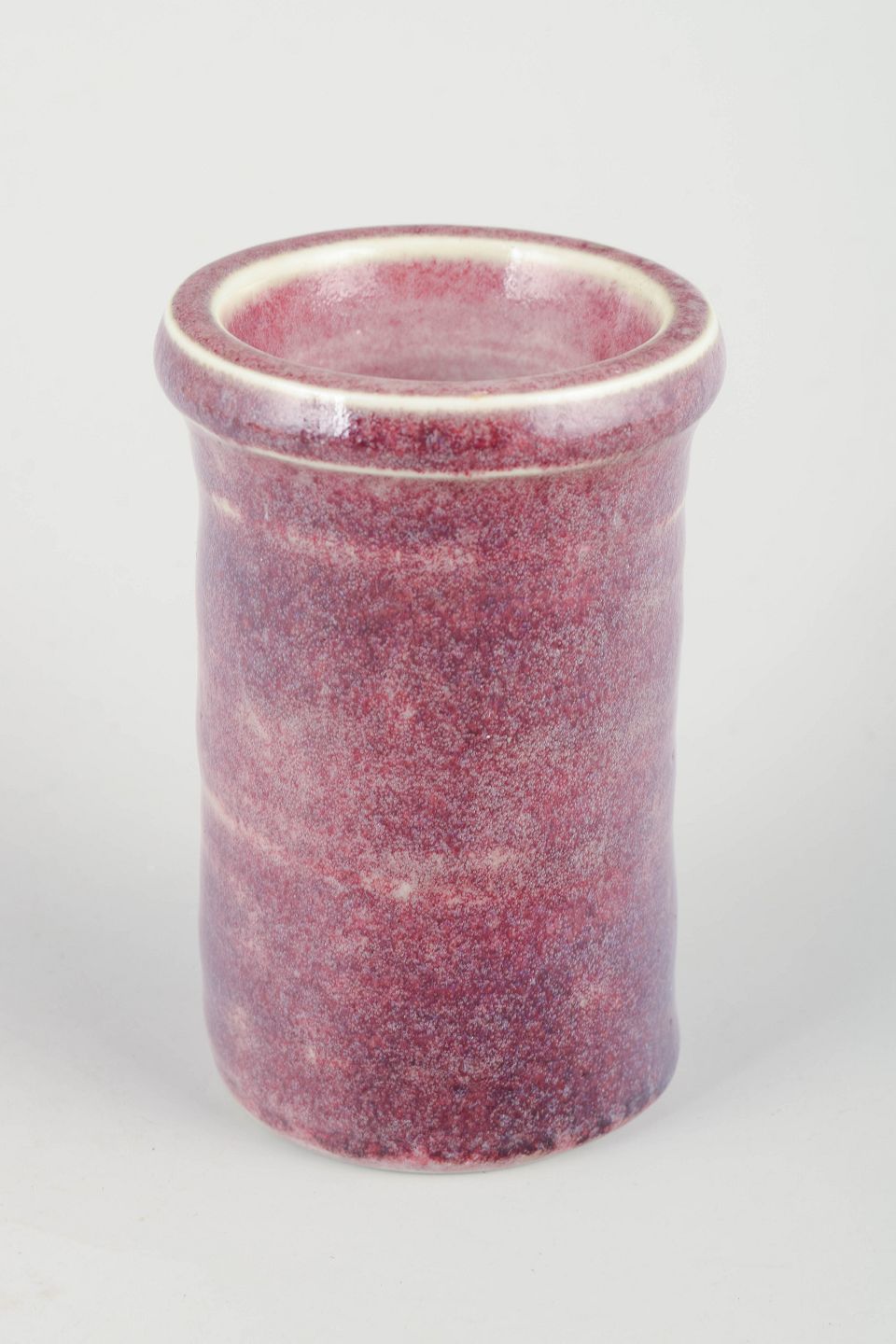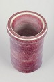 Cylinderformet studiovase i drejet stentøj med eksperimentel rosa-lilla testglasur og lys kantprofil, signeret med monogram under bunden.